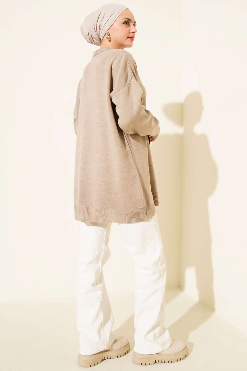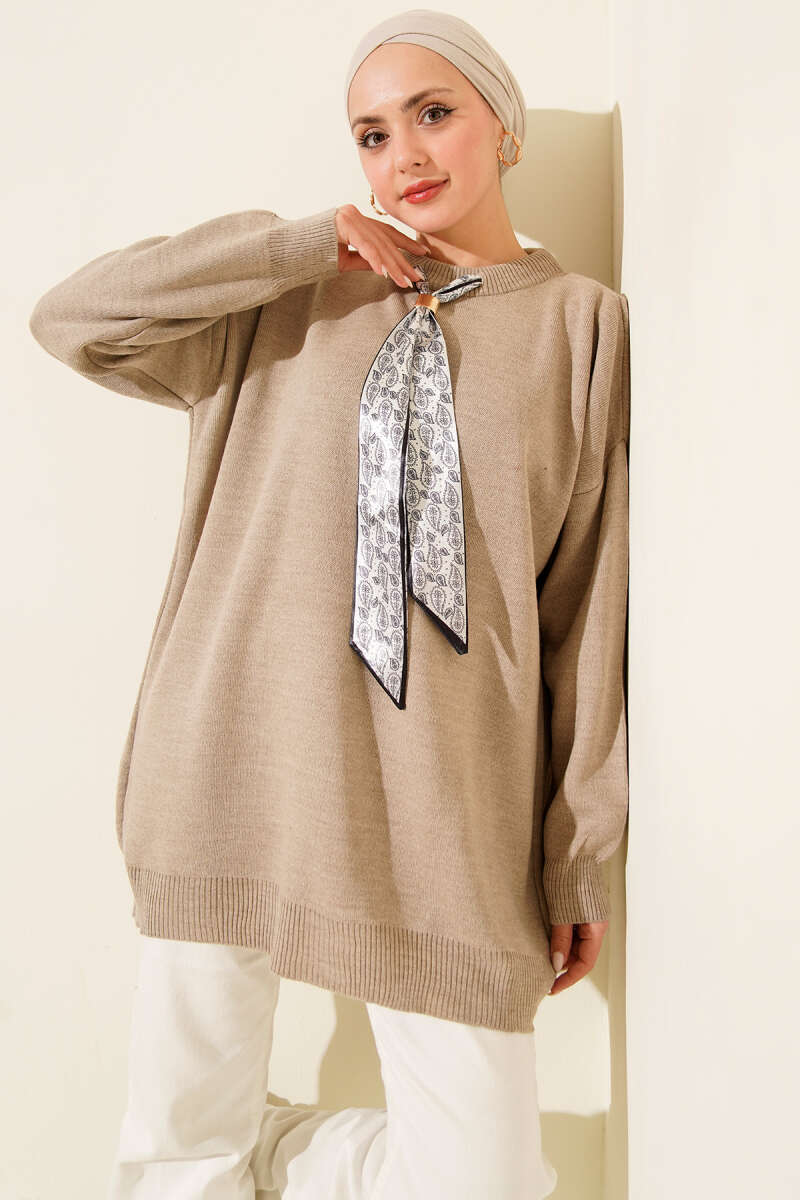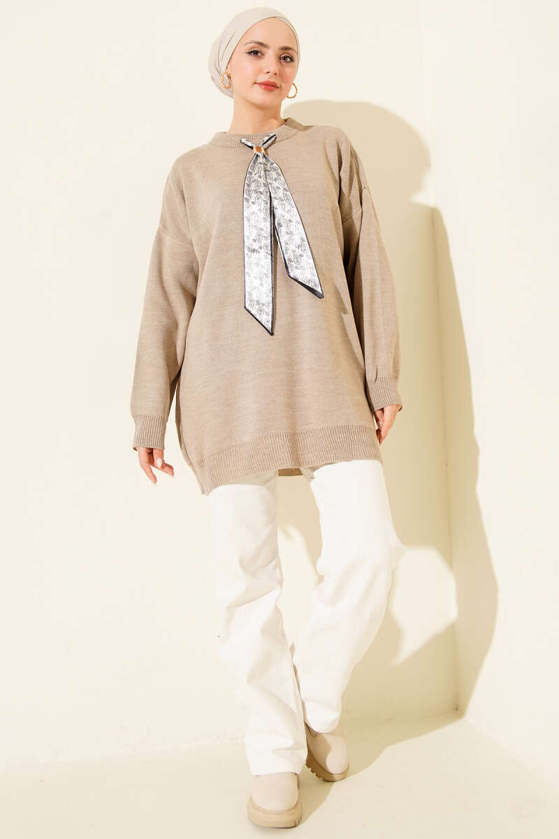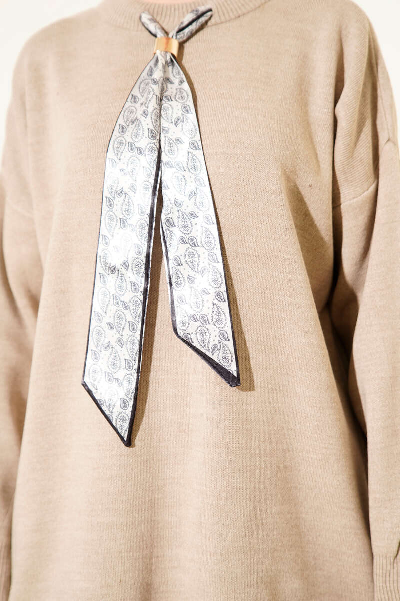 Yaka Fularlı Yumoş Triko Tunik Kahve