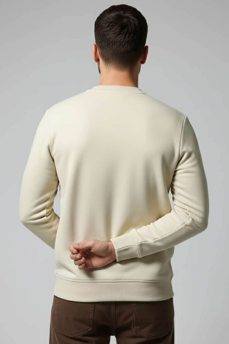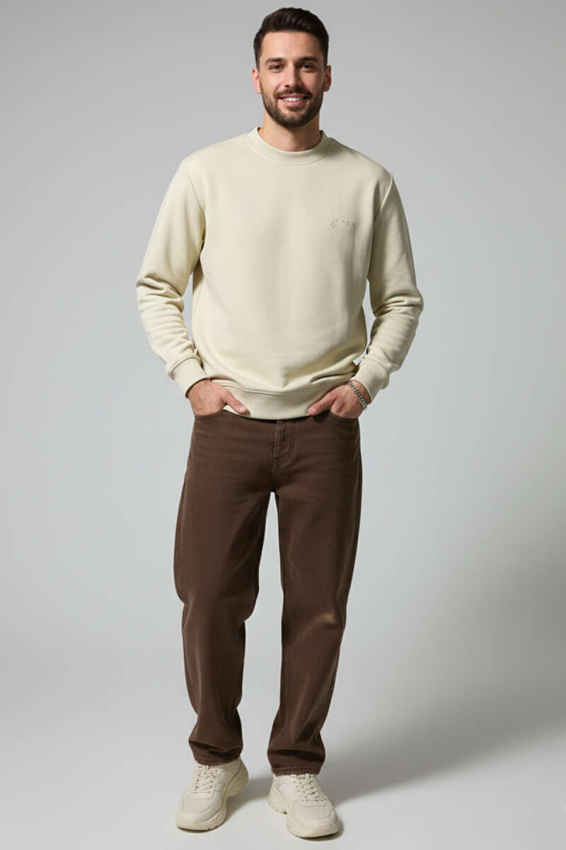 Üç İplik Bisiklet Yaka Erkek Sweatshirt Ekru