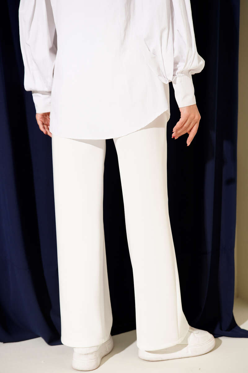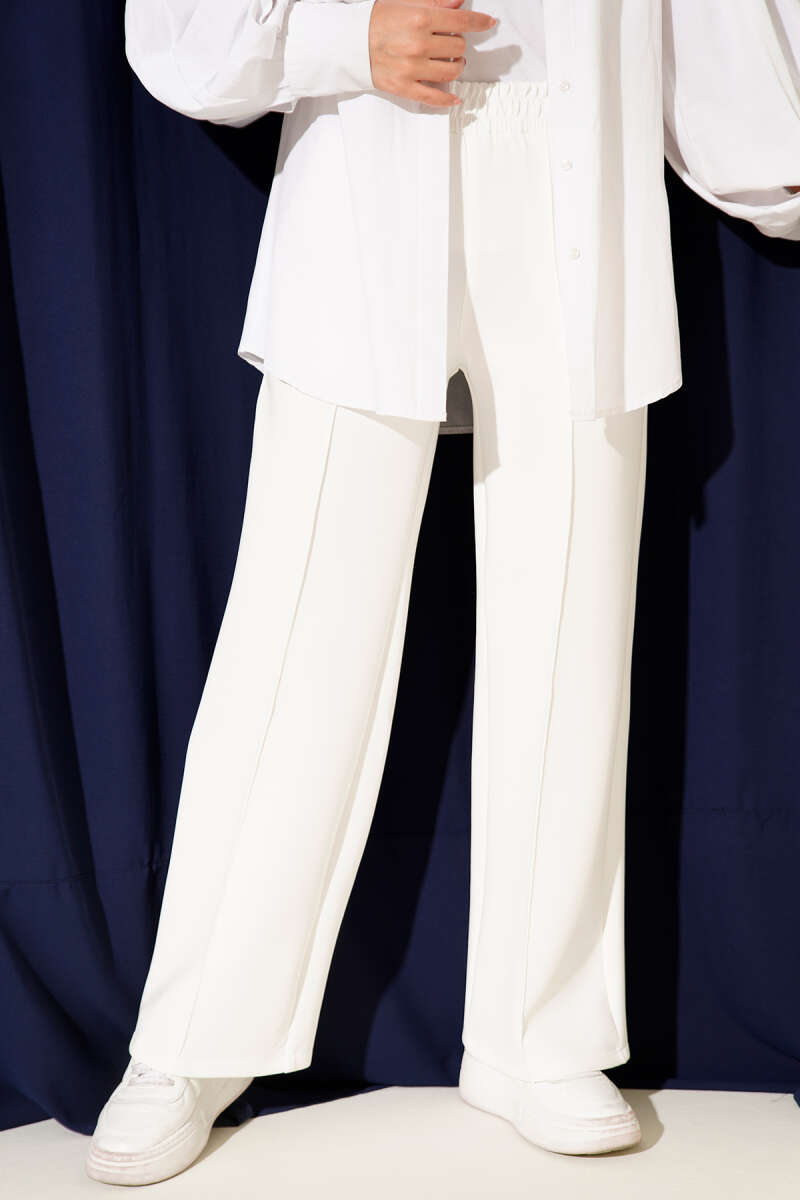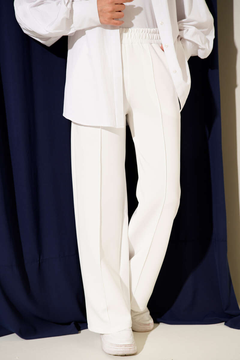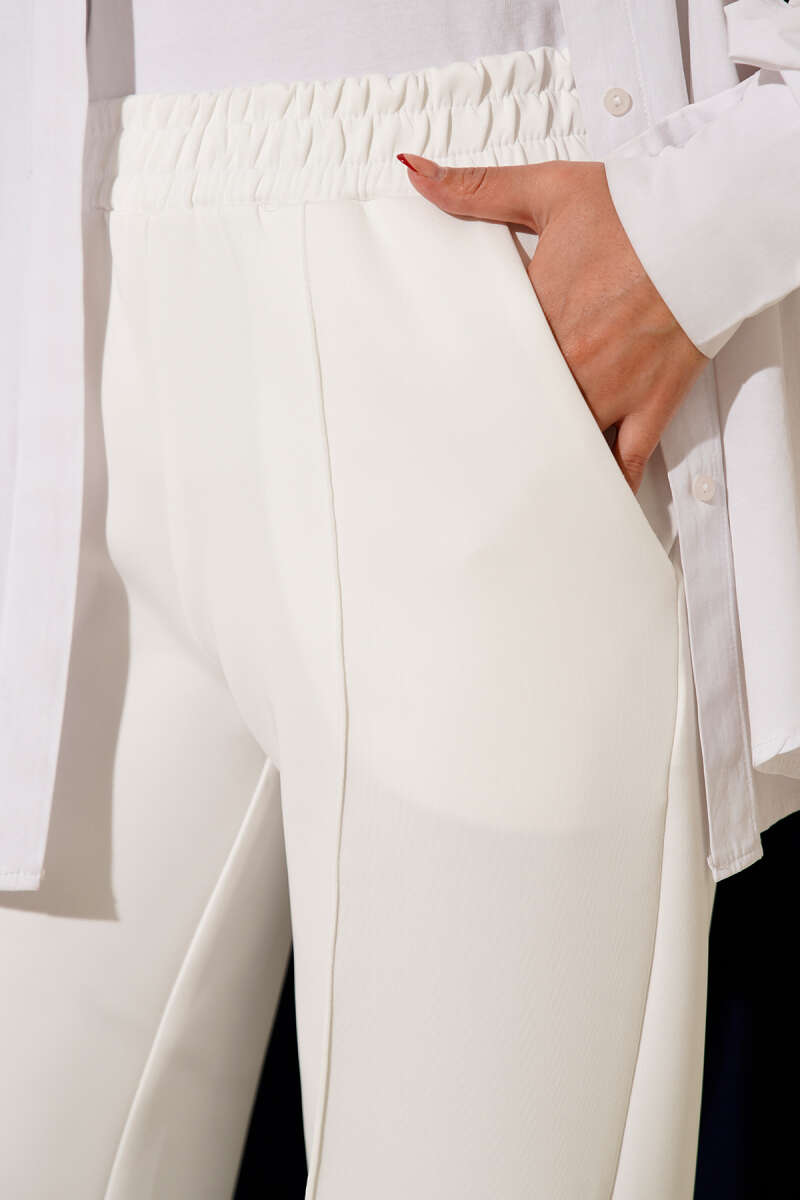 Geniş Bel Lastikli Çımalı Pantolon Beyaz