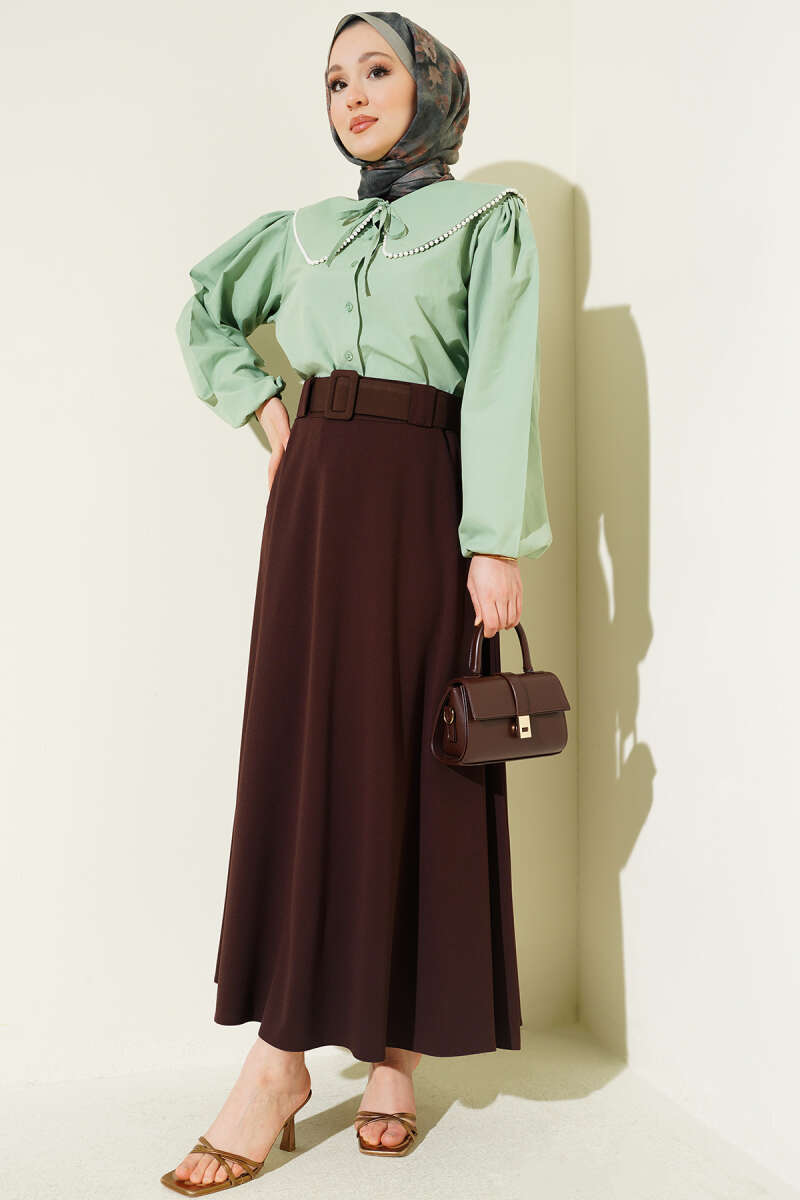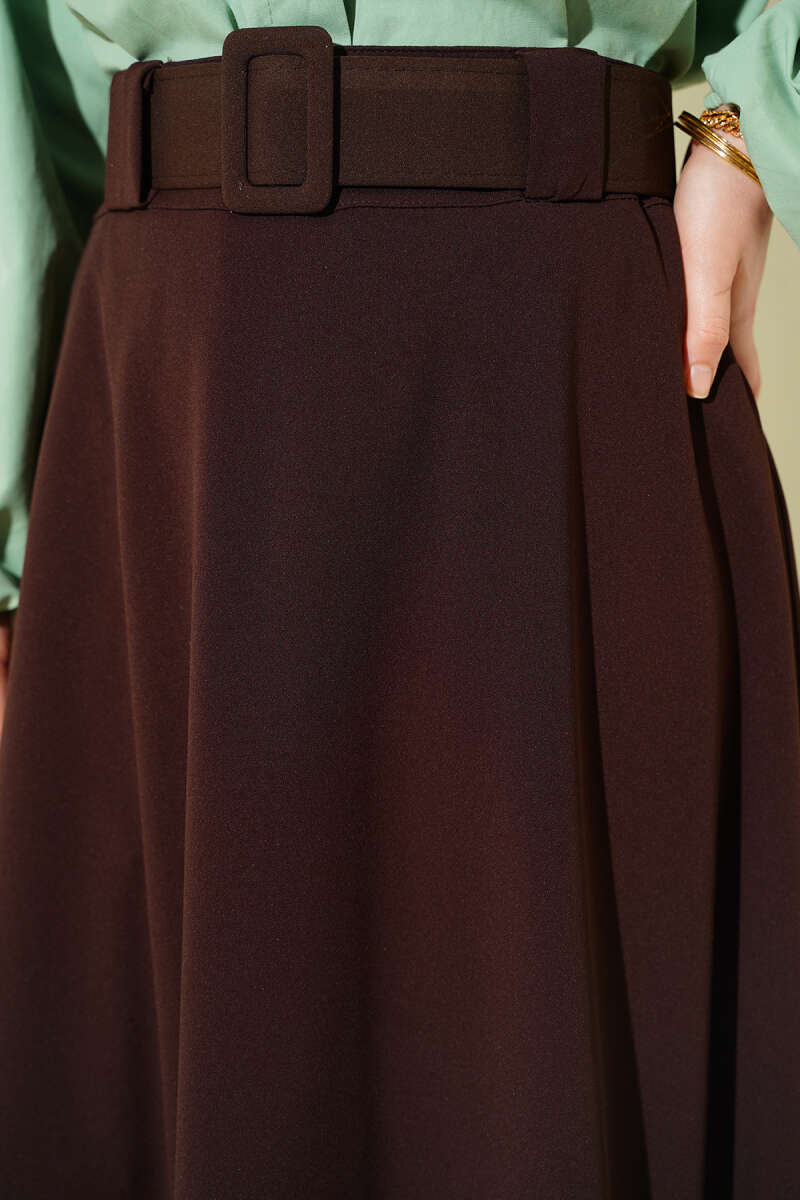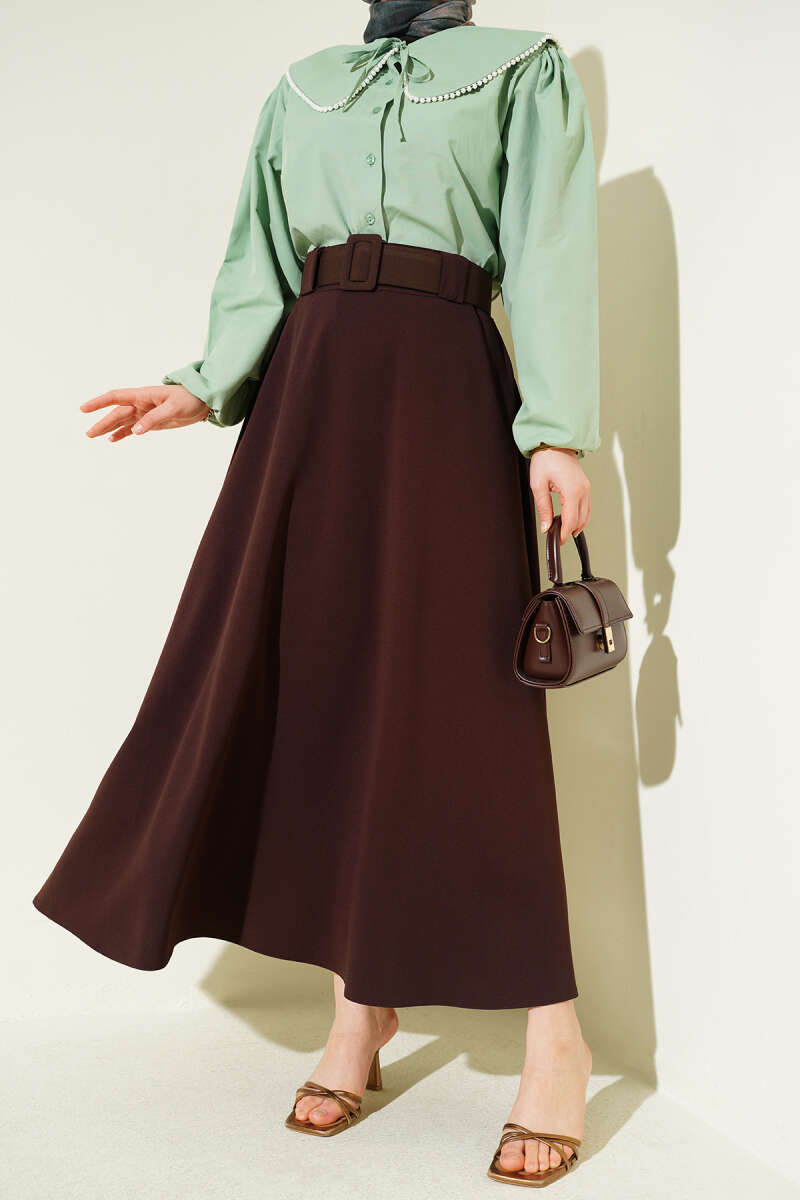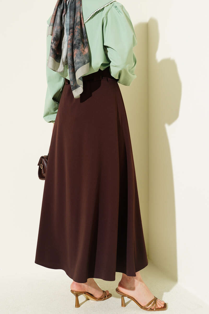 Zarif ve modern bir silüet sunan bu kloş etek, yüksek bel kesimi ve geniş formuyla klasik bir şıklık vadediyor. Kendinden kemer detayı ve iri tokasıyla bel hattını zarifçe vurgularken, dökümlü kumaşı gün boyu konforlu bir hareket alanı sağlıyor.