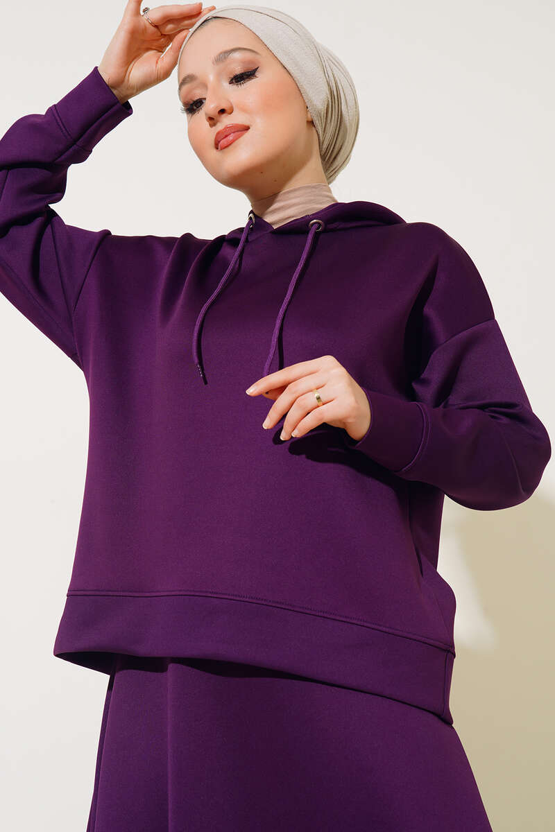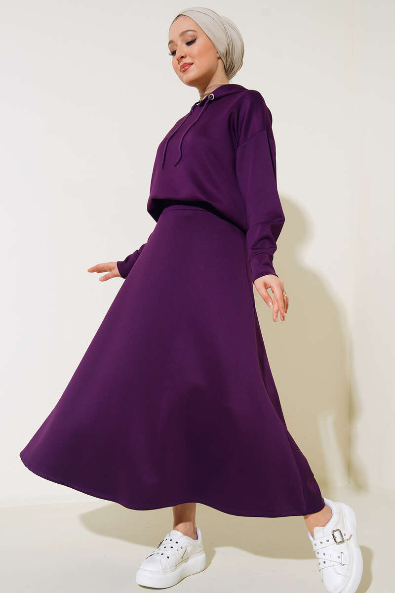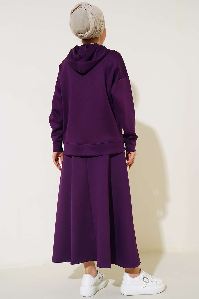 Takımımız etek ve tunik olarak iki parçadan oluşmaktadır. Ürünümüz scuba kumaştır. Tunik kapüşonlu modeldir ve bağcık detayları bulunmaktadır. Etek beli lastikli ve esnektir. Tuniğimizin önü kısa arkası uzun model olup düşük omuzludur.