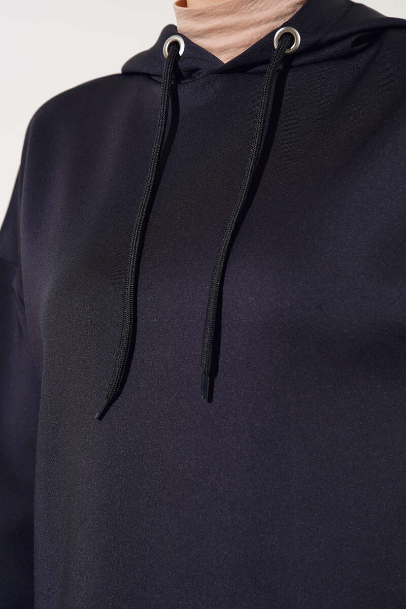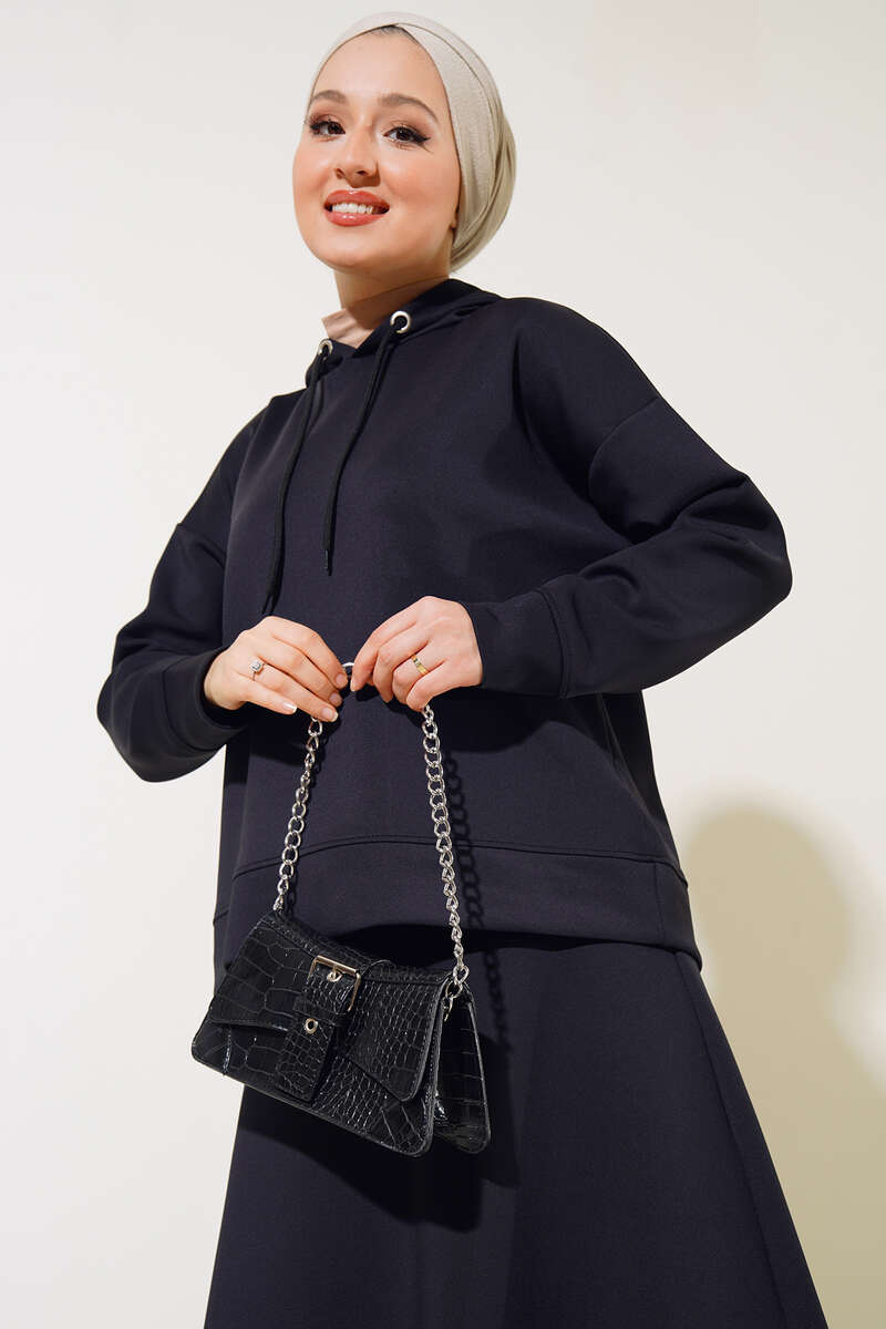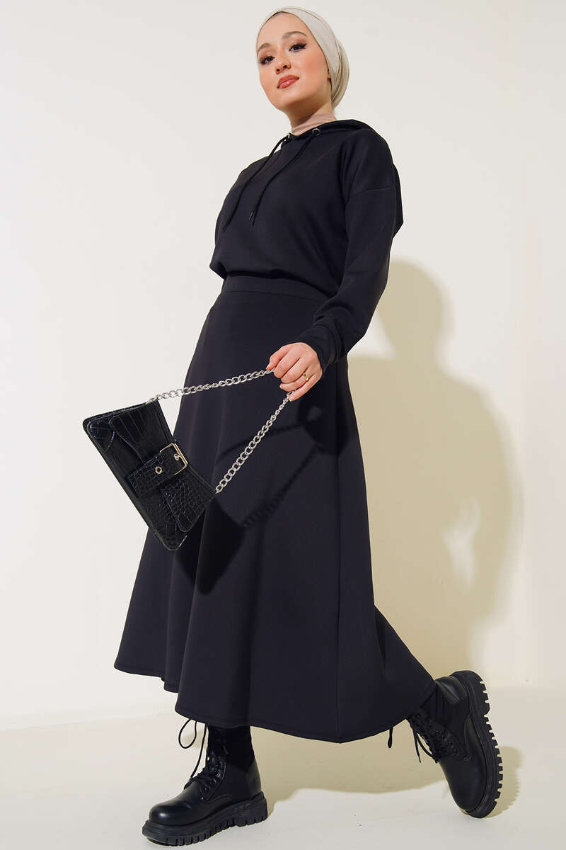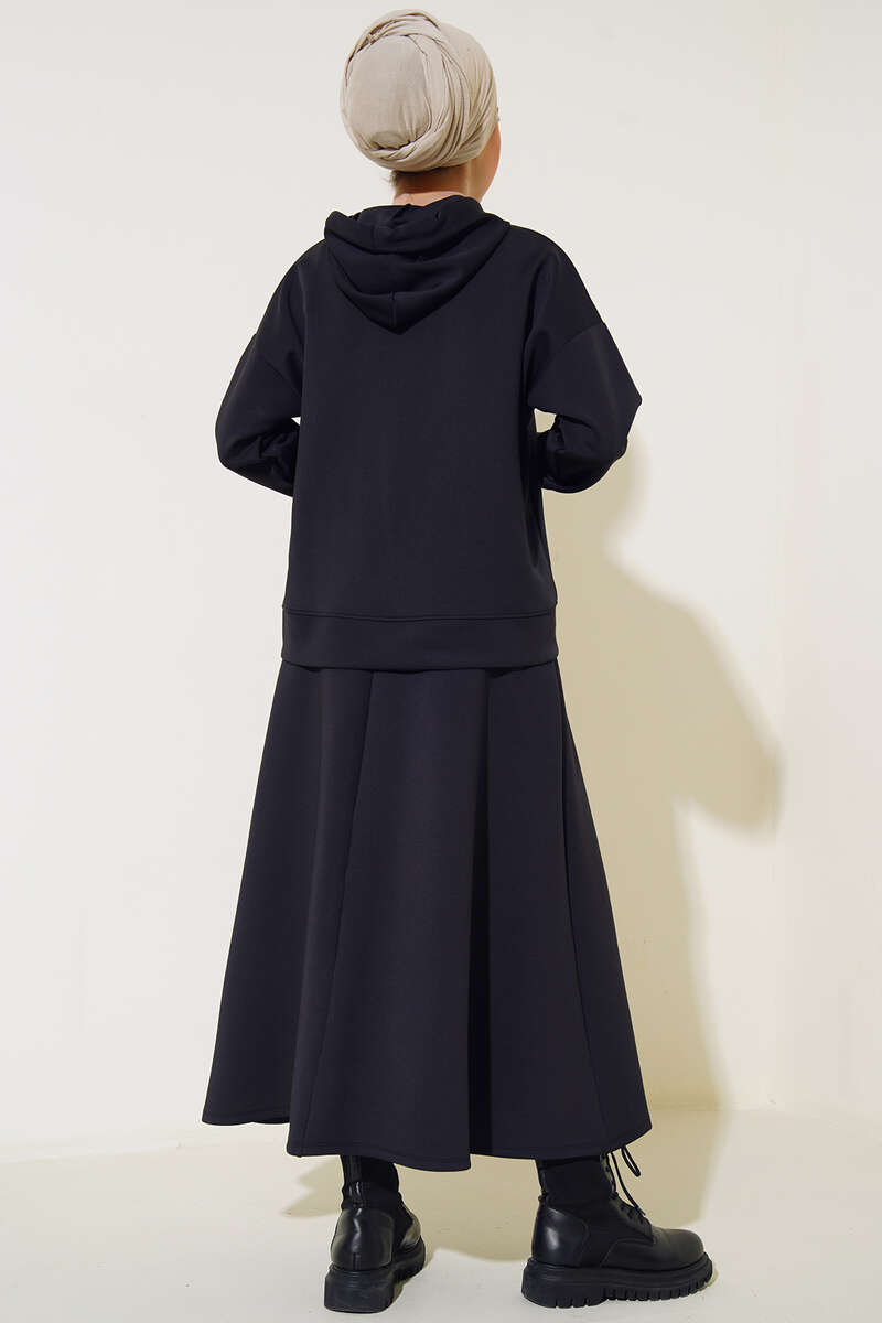 Takımımız etek ve tunik olarak iki parçadan oluşmaktadır. Ürünümüz scuba kumaştır. Tunik kapüşonlu modeldir ve bağcık detayları bulunmaktadır. Etek beli lastikli ve esnektir. Tuniğimizin önü kısa arkası uzun model olup düşük omuzludur.