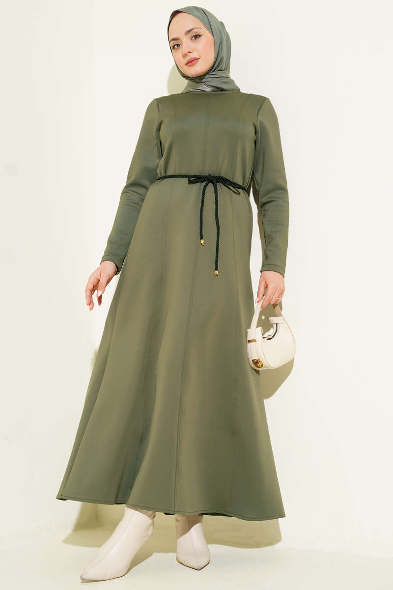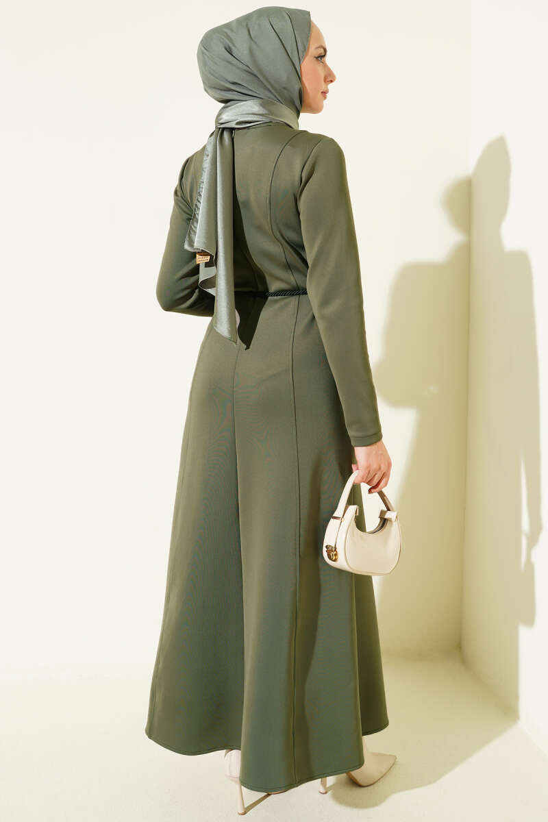 Scuba Pens Detaylı Kemerli Elbise Haki