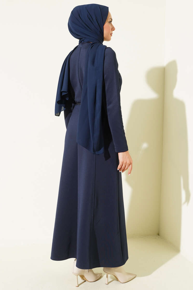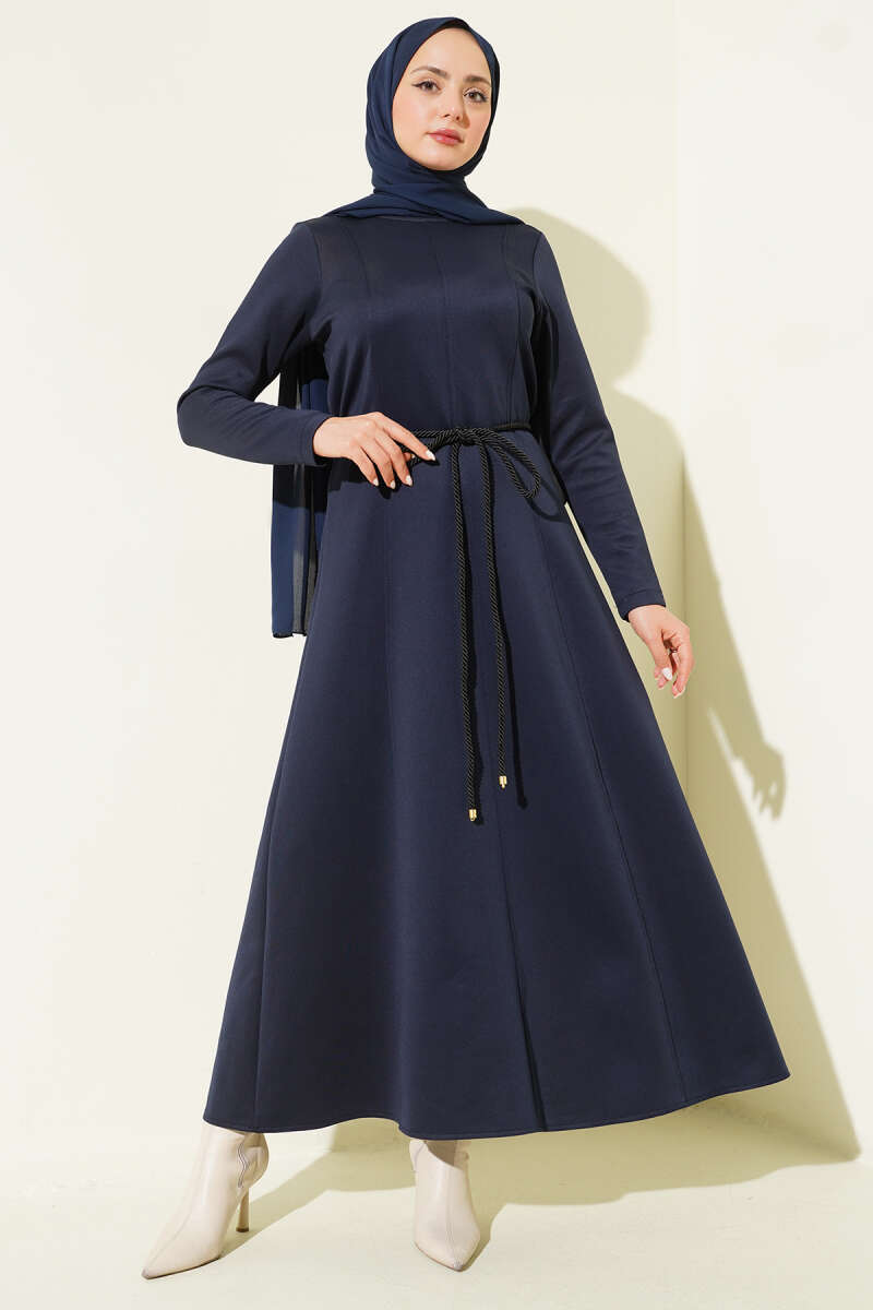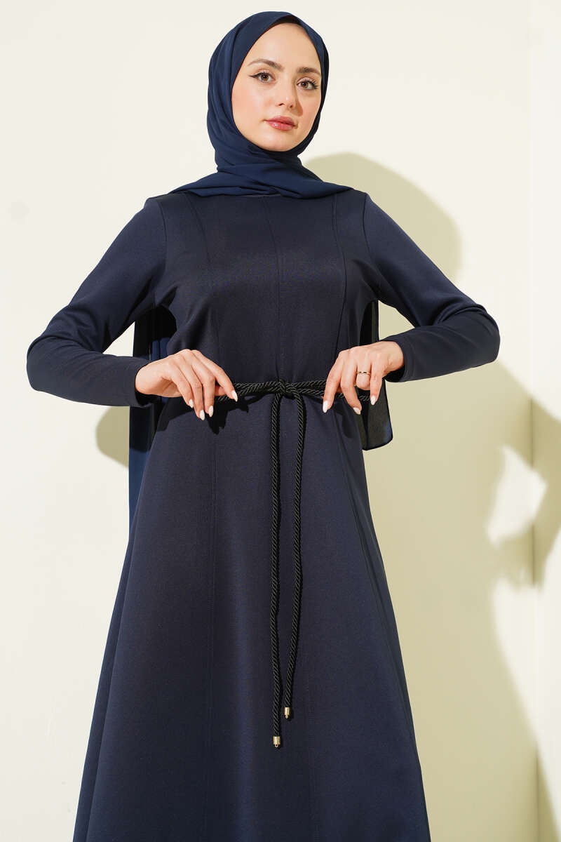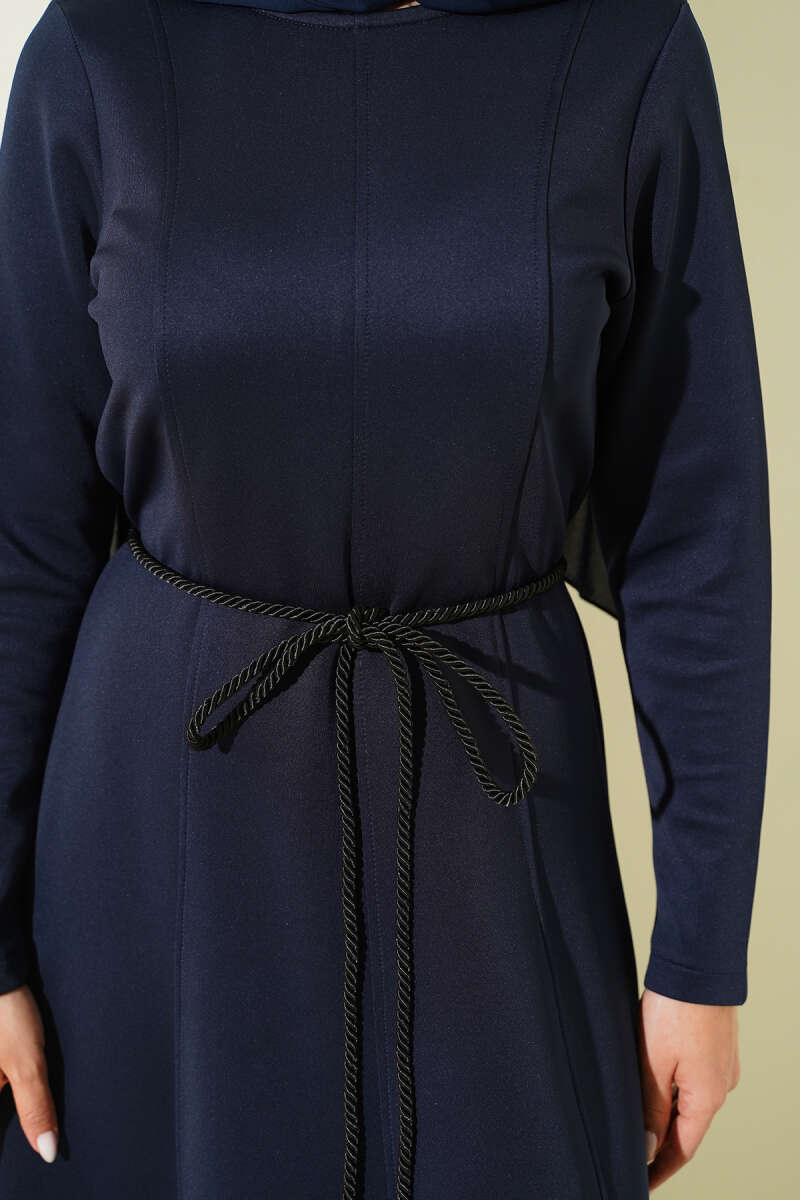 Düğmeli Tensel İnce Kemerli Elbise Lacivert