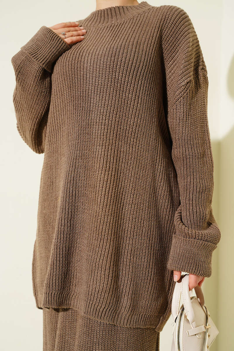 Selanik Örgülü Etekli Triko İkili Takım Kahve