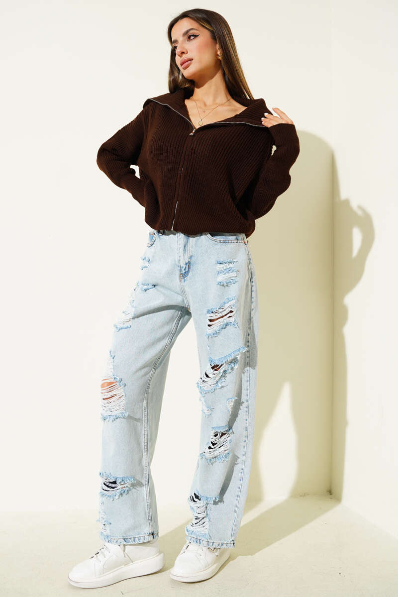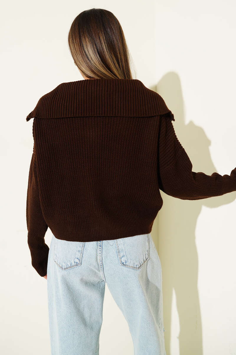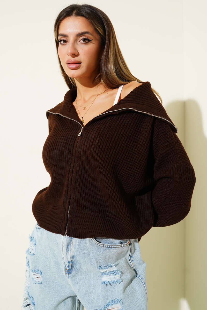 Selanik Örgülü Fermuarlı Hırka Kahve