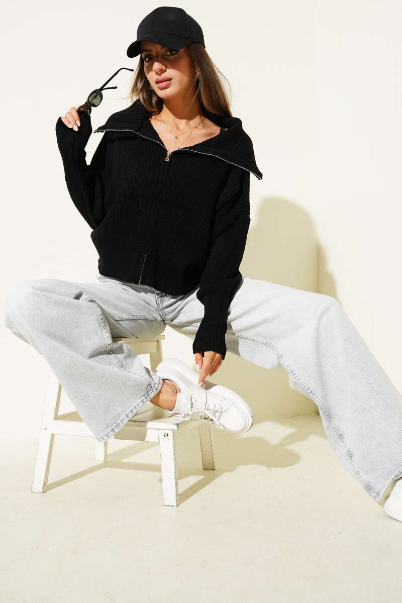 Selanik Örgülü Fermuarlı Hırka Siyah