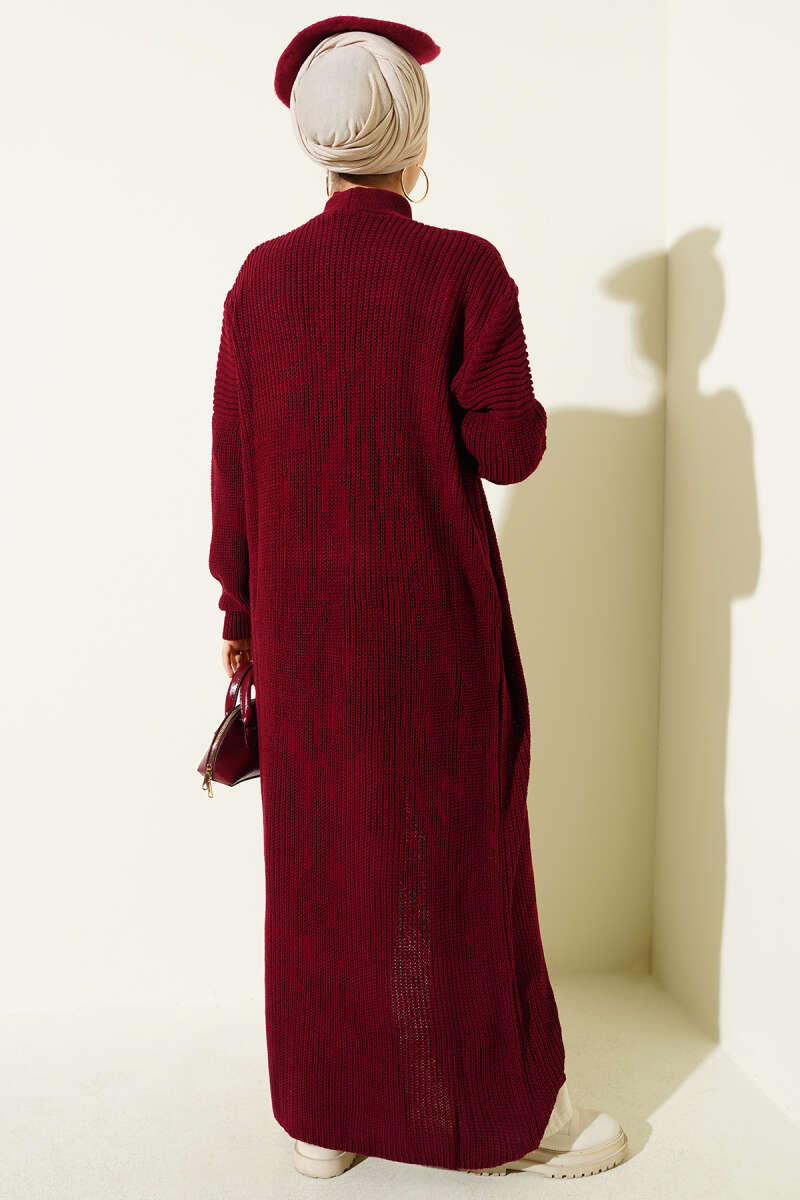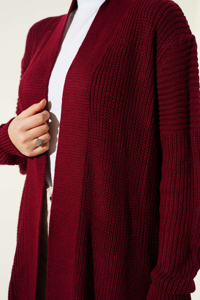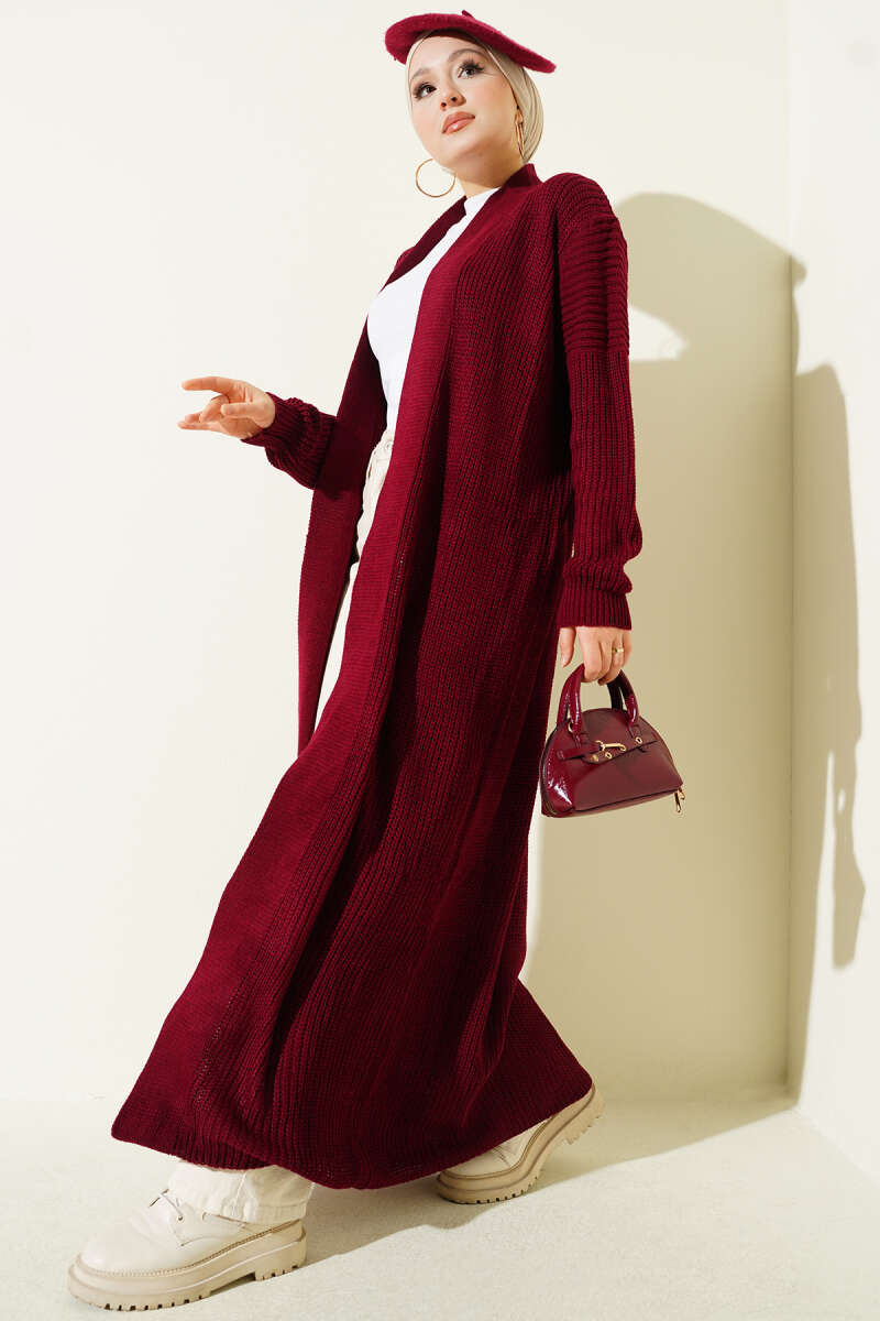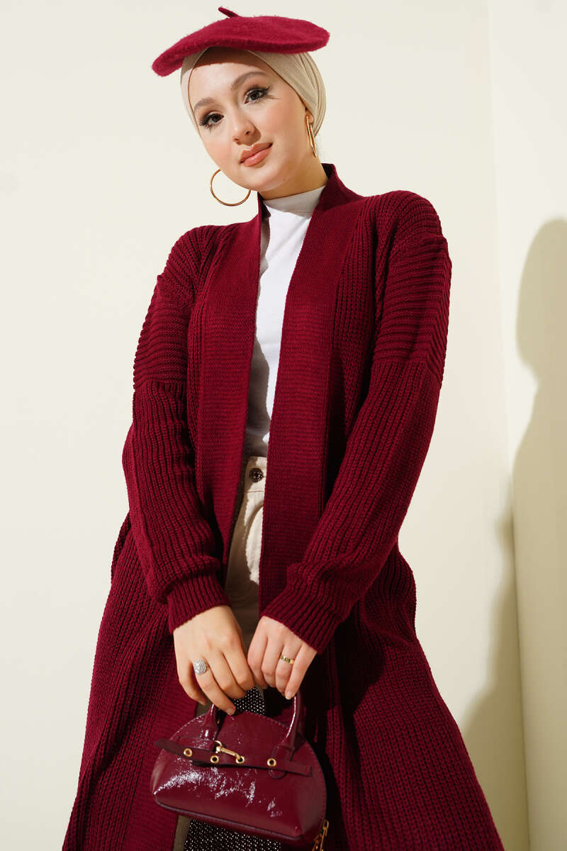 Selanik Örgülü Uzun Triko Hırka Kırmızı