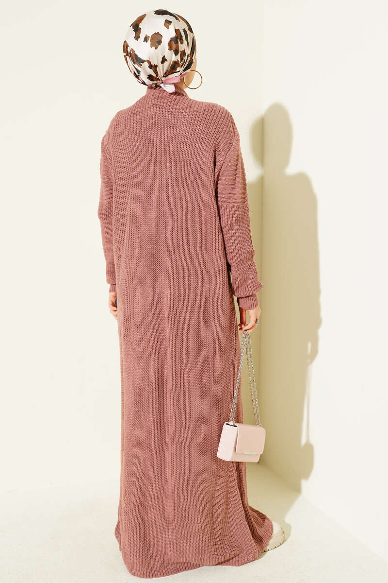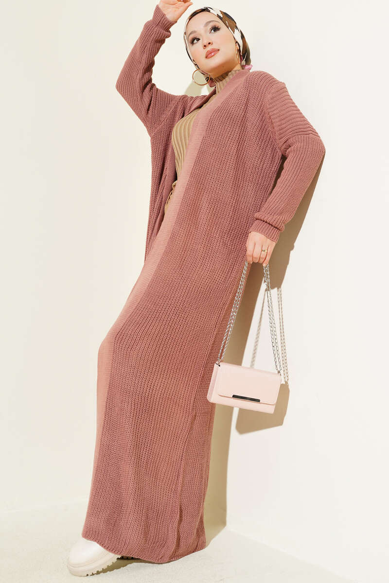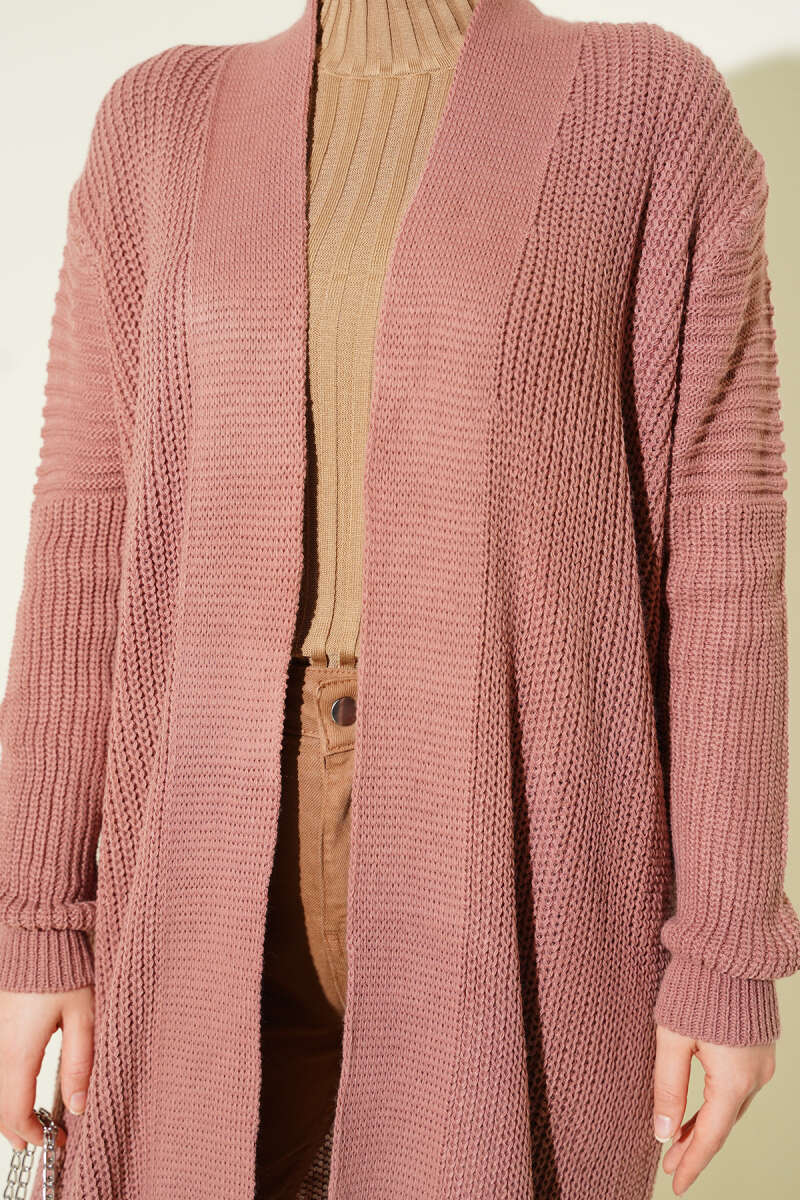 Selanik Örgülü Uzun Triko Hırka Pembe