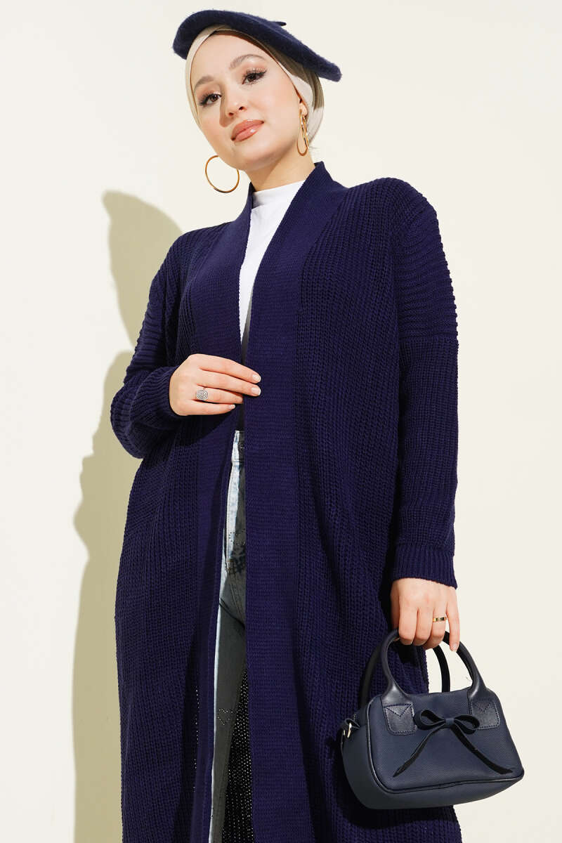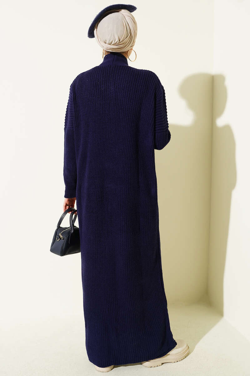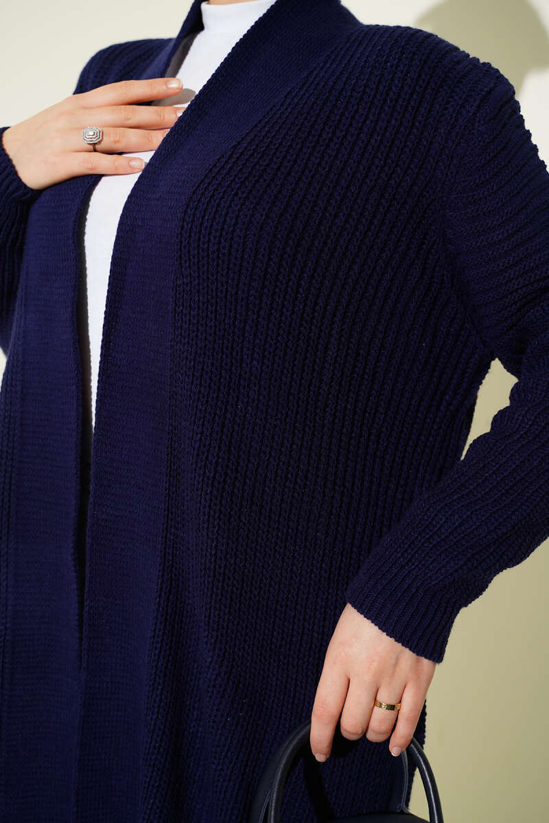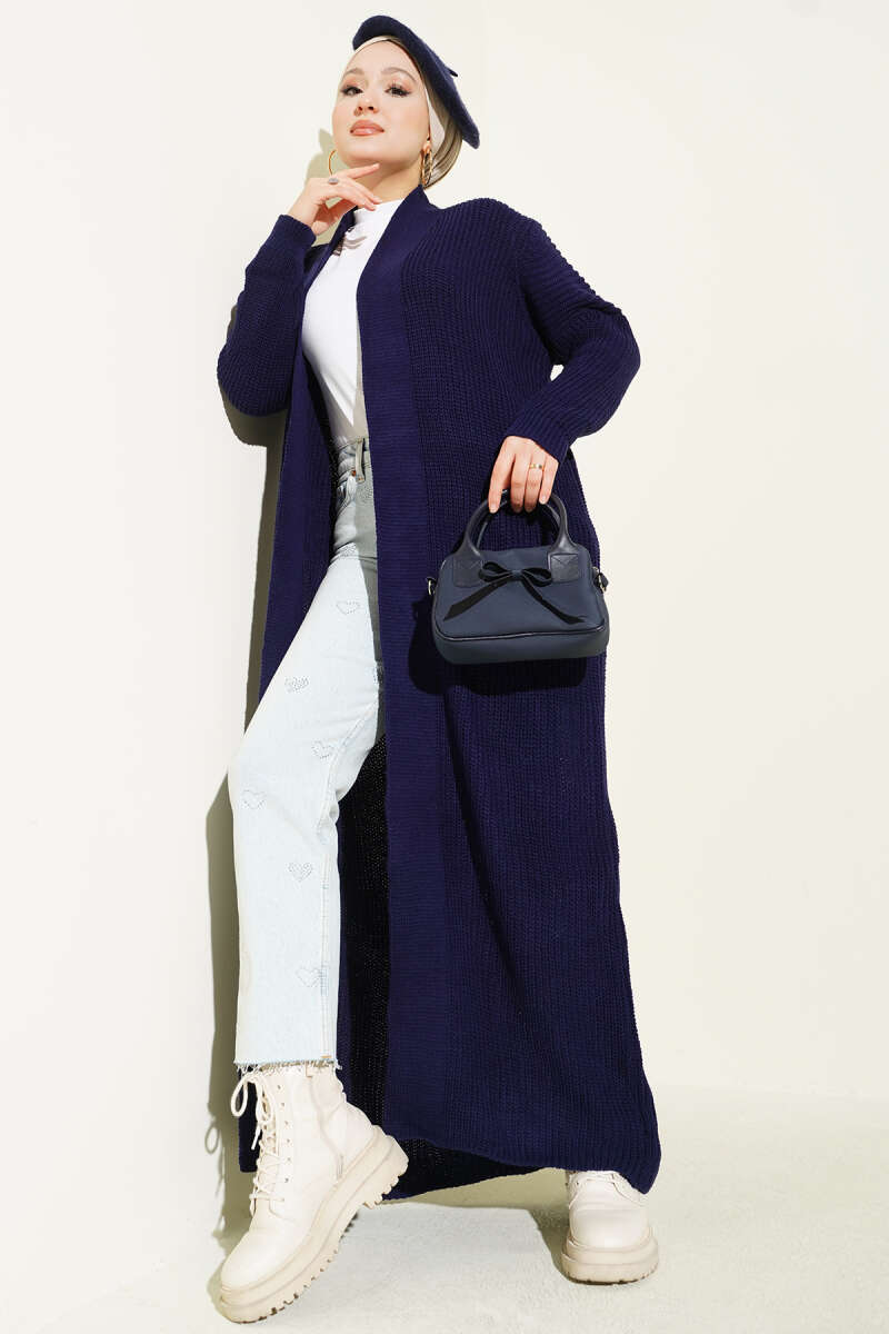 Selanik Örgülü Uzun Triko Hırka Petrol