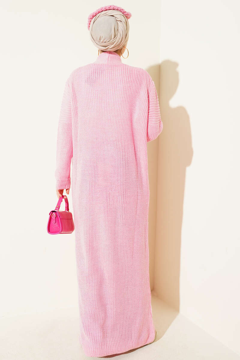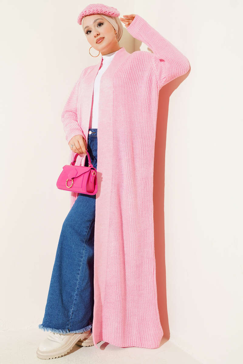 Selanik Örgülü Uzun Triko Hırka Gül Kurusu