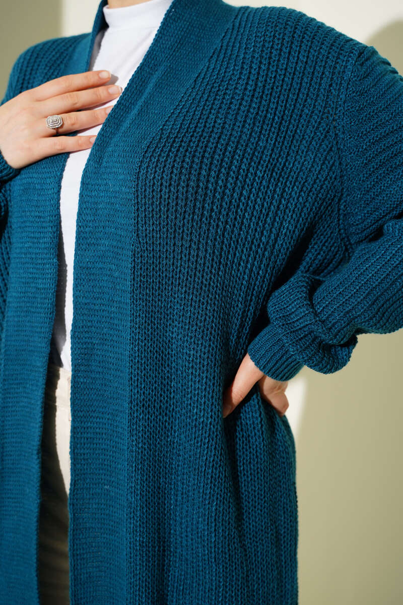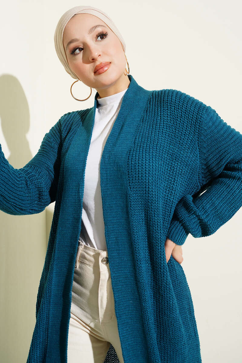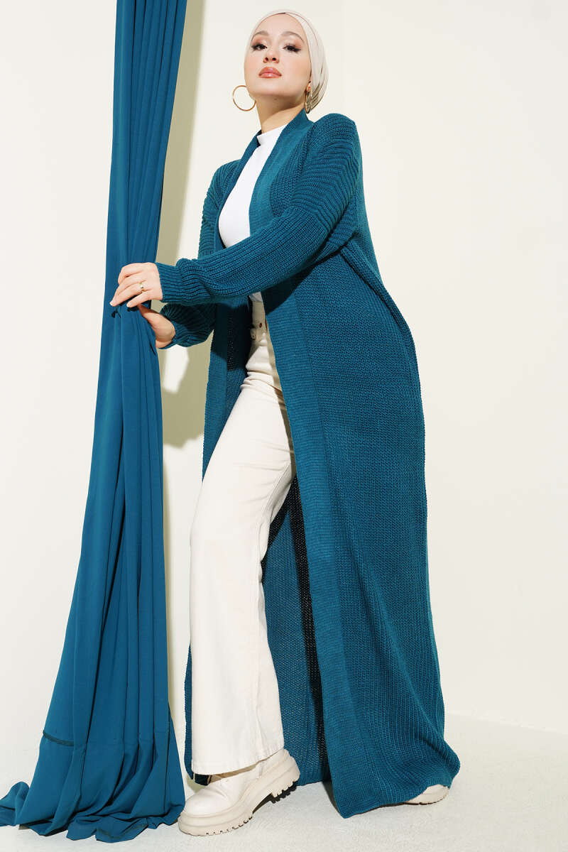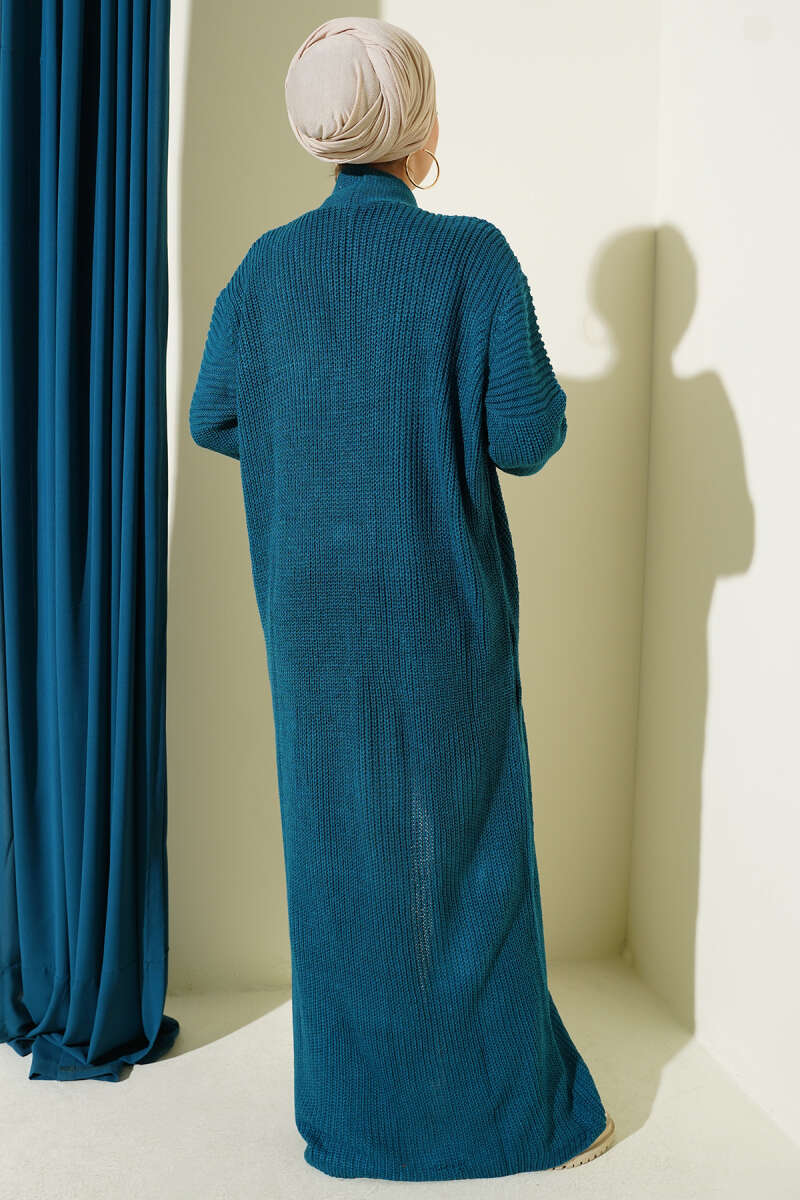 Selanik Örgülü Uzun Triko Hırka Turkuaz