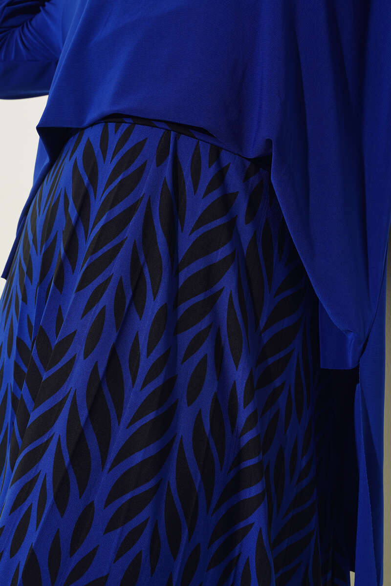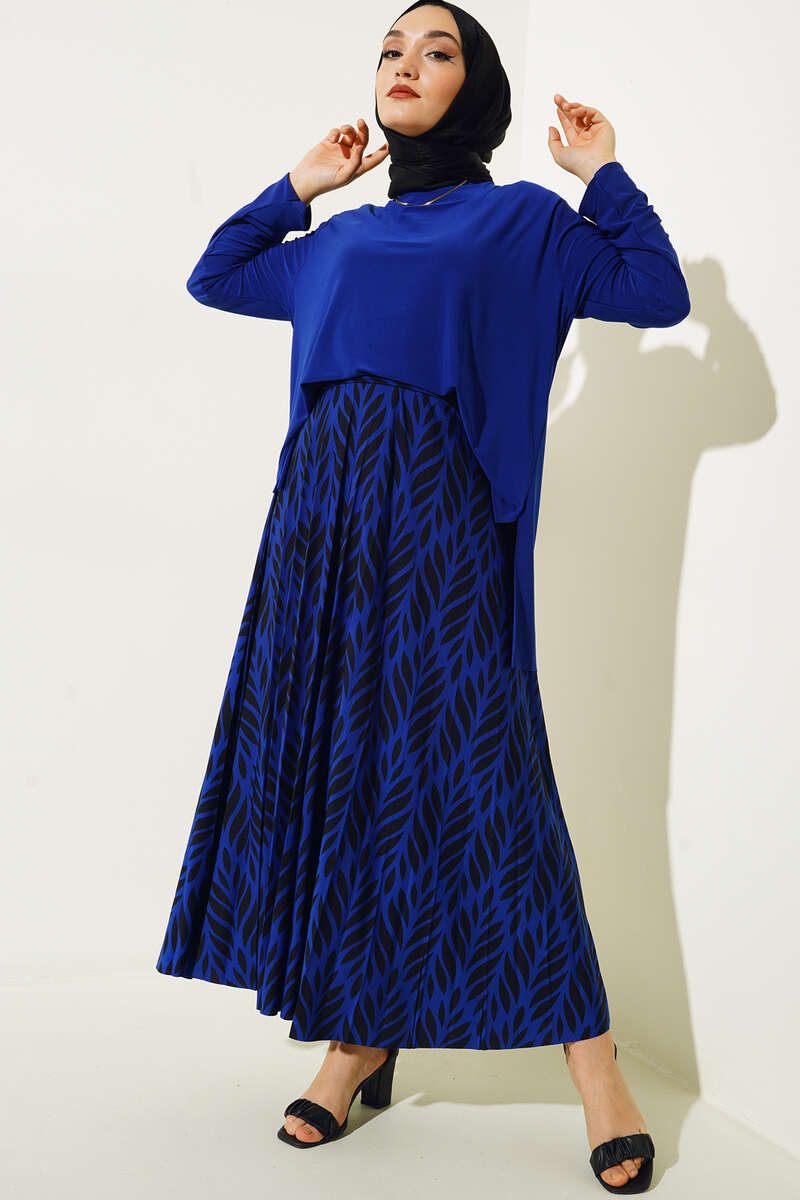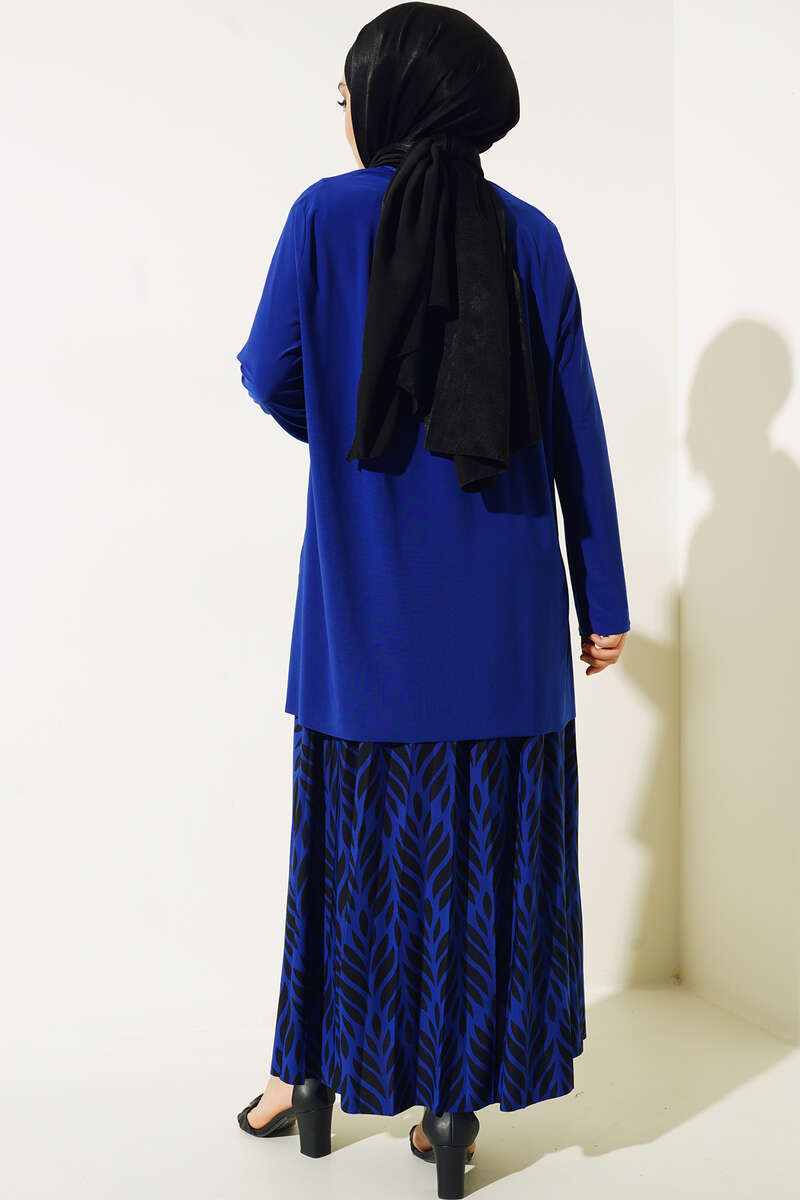 Yeni sezon tunik etek ikili takımımız tasarımındaki detaylarla farkını ortaya koymaktadır. Tuniğimiz oval yakadır. Yanları yırtmaçlıdır. Eteğimizde bulunan yaprak desenleri dikkat çekmektedir. Kolye aksesuar olarak kullanılmıştır.