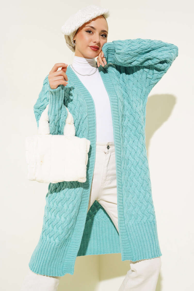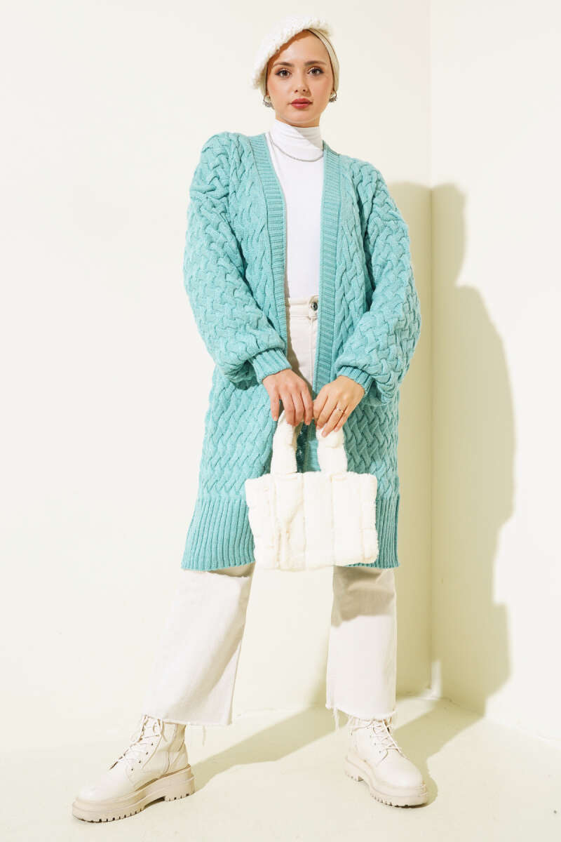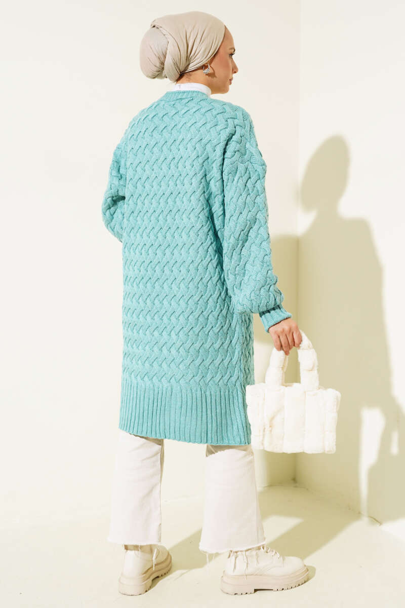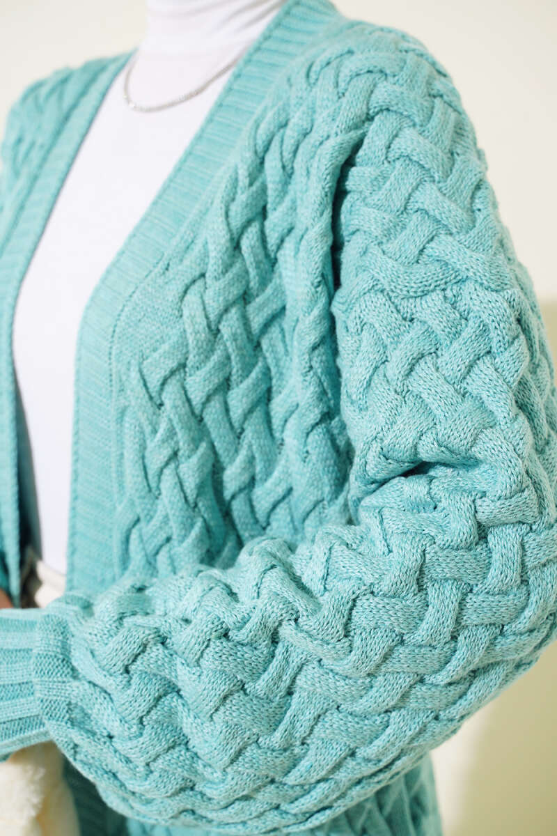 Saç Örgülü Düğmeli Triko Hırka Zümrüt