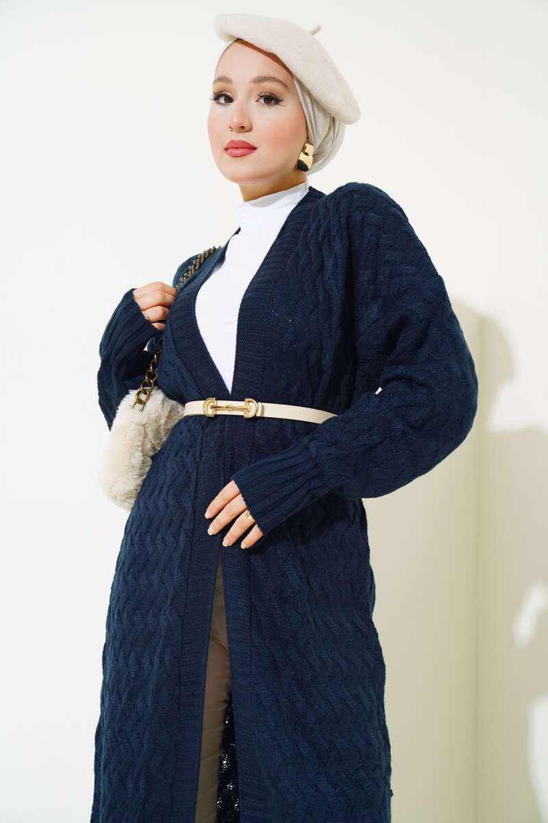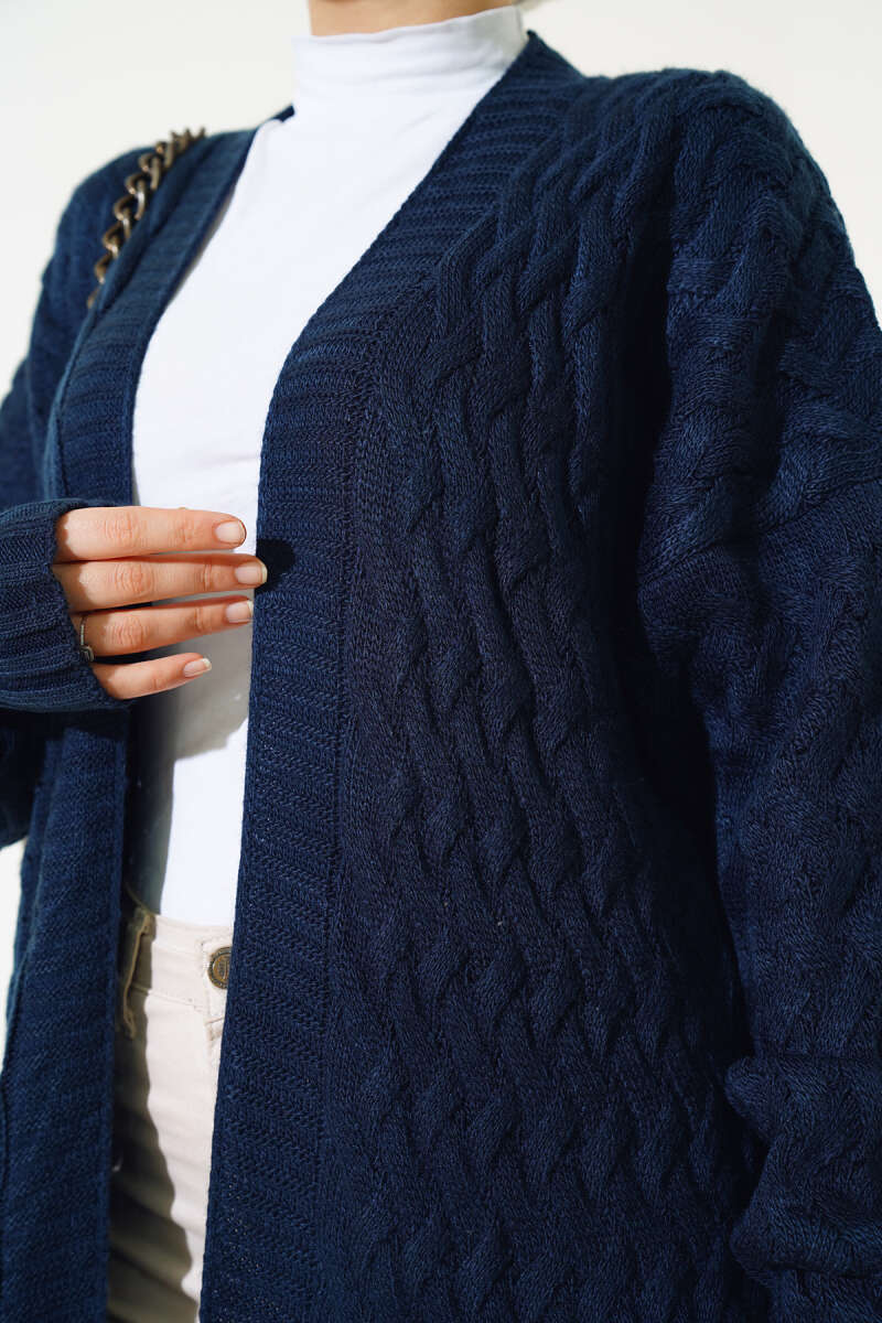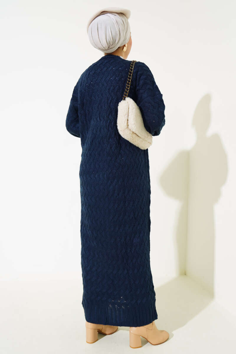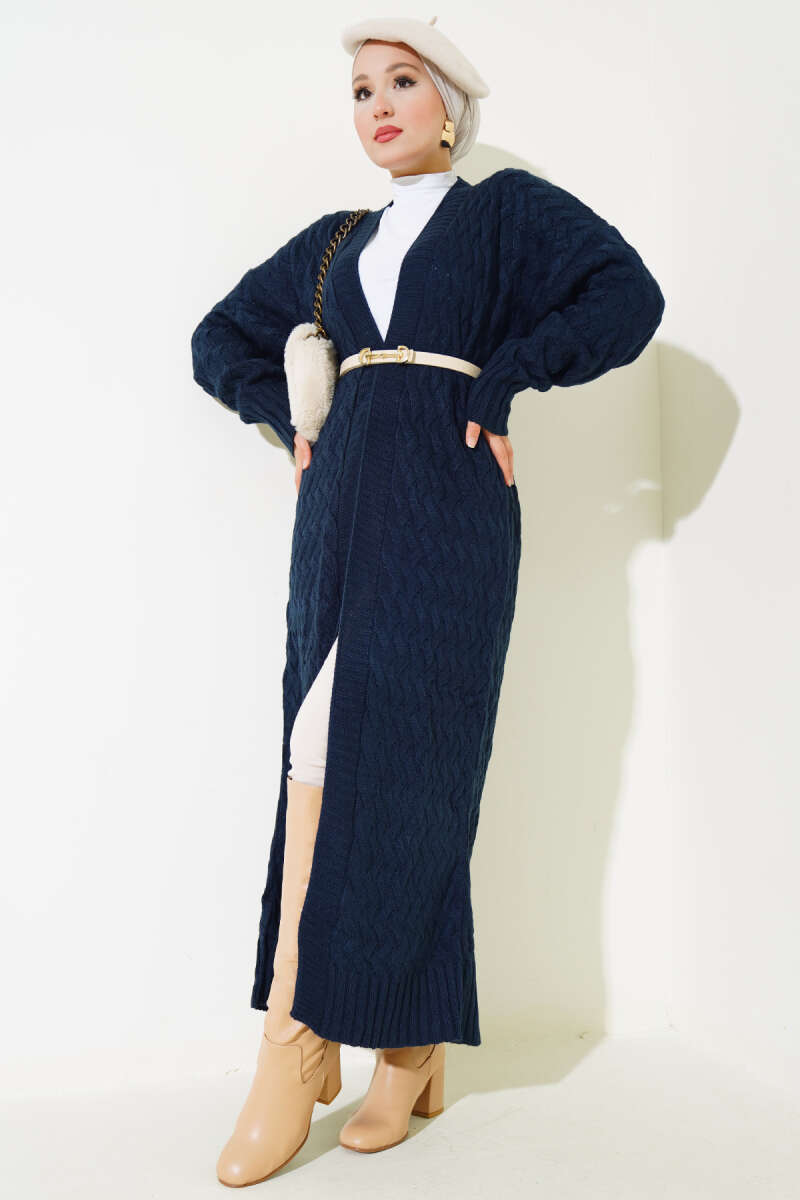 Ponponlu Düğmeli Uzun Triko Hırka Petrol