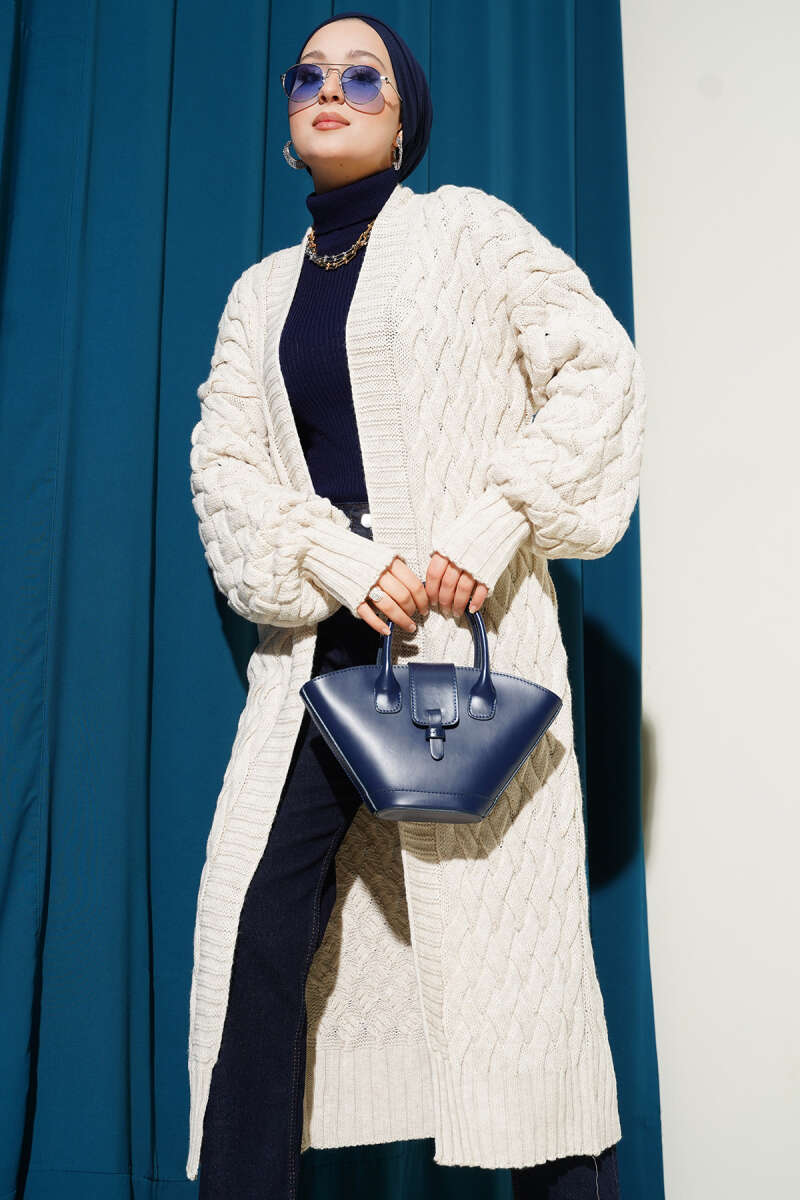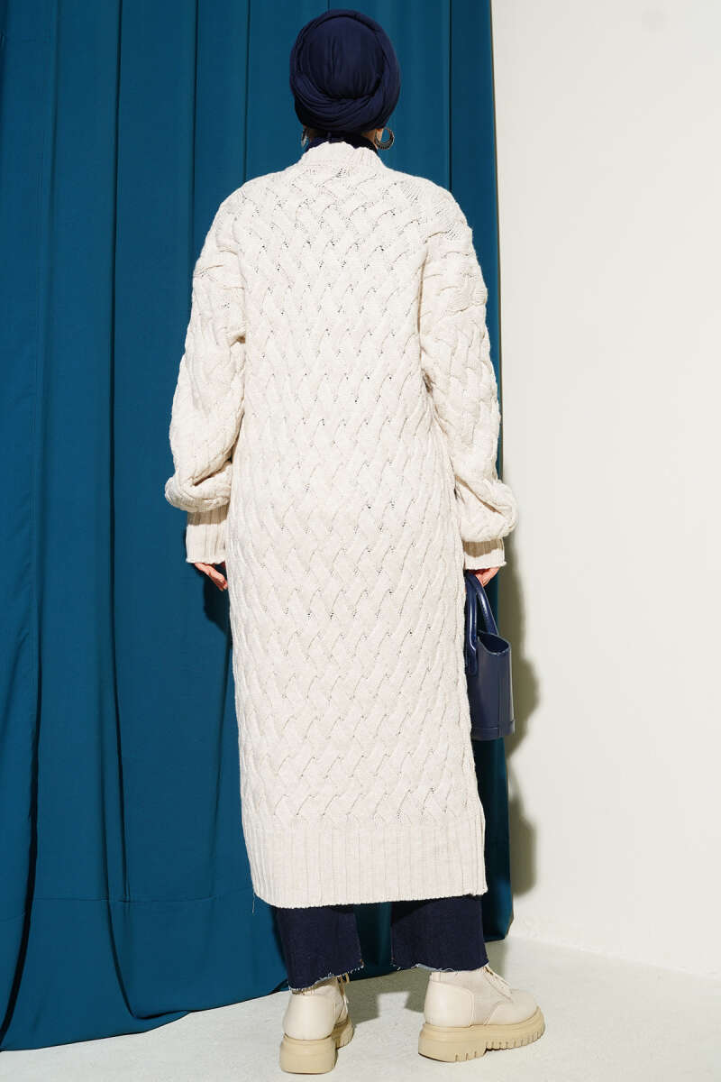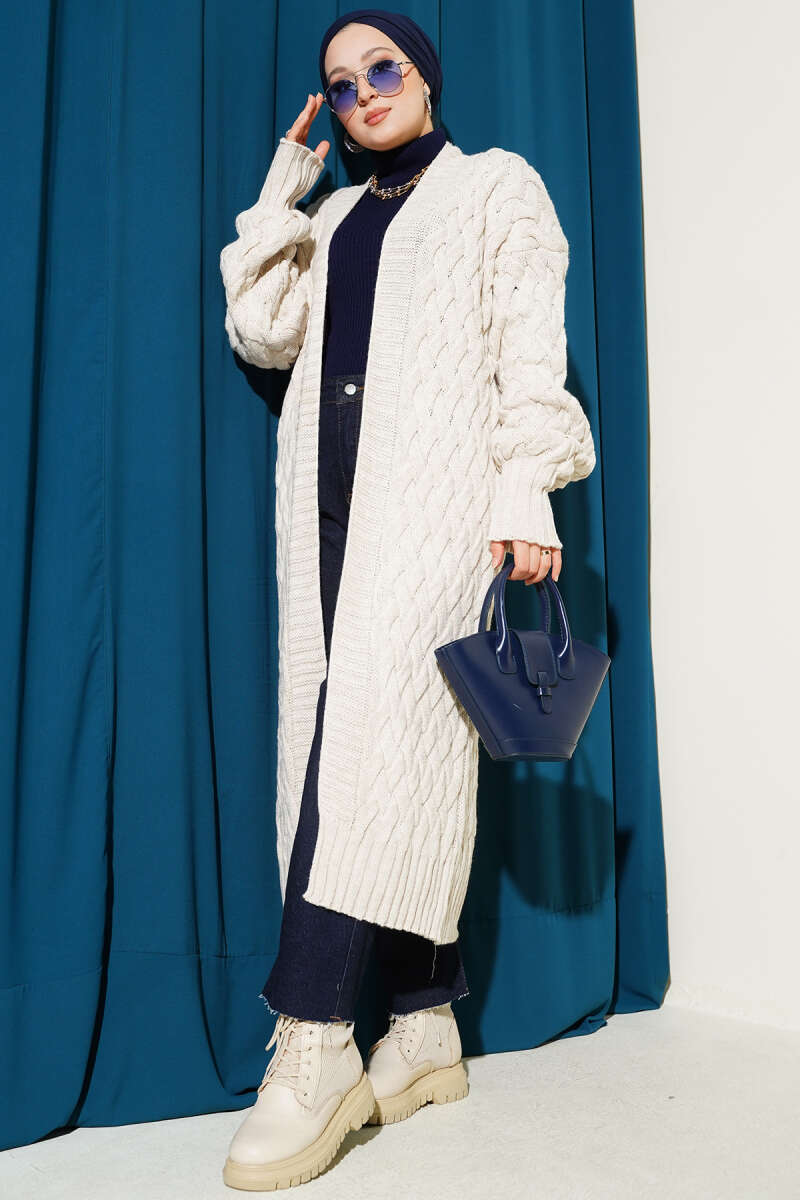 Kol Sepet Örgülü Triko Hırka Bej