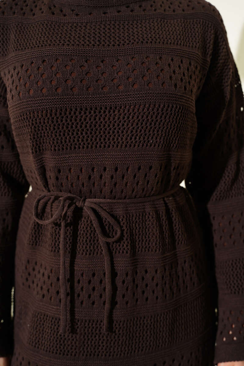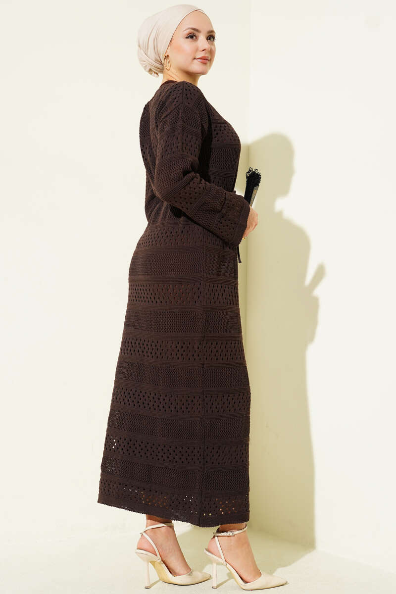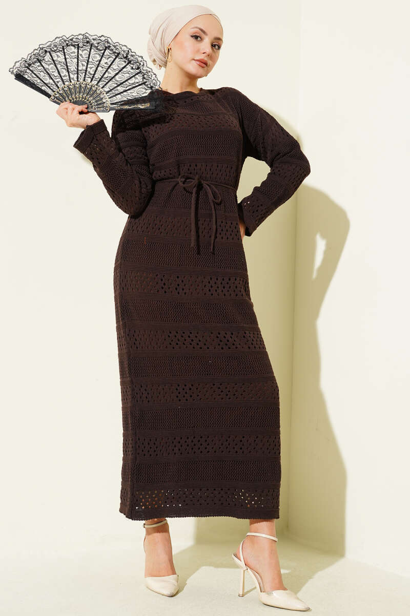 Şerit Ajur Desen Triko Elbise Füme