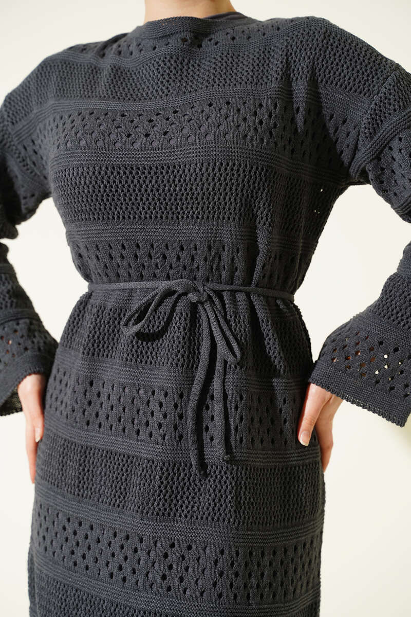 Şerit Ajur Desen Triko Elbise Siyah