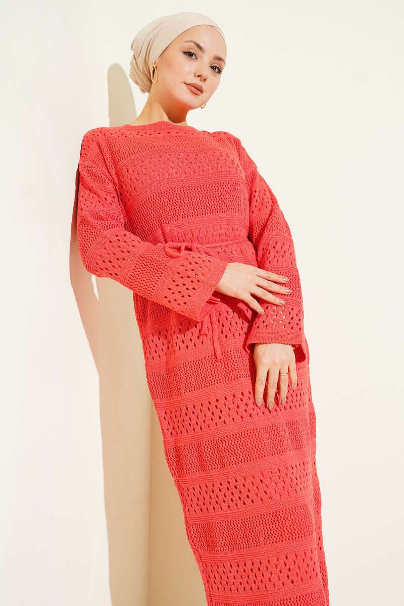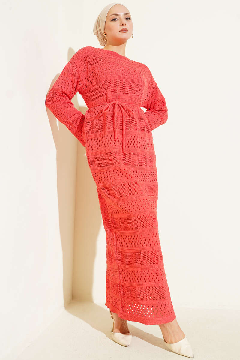 Şerit Ajur Desen Triko Elbise Oranj