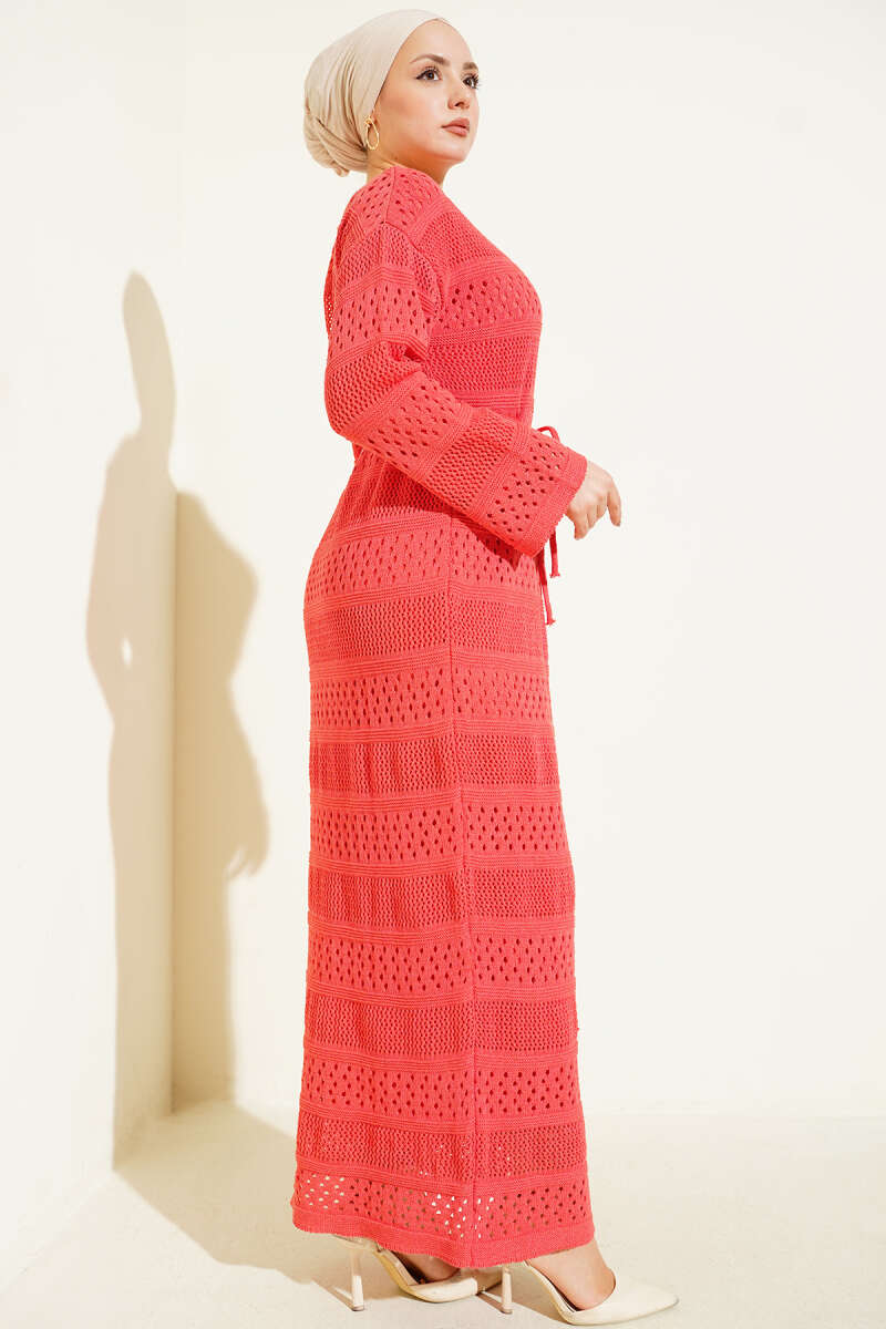 Şerit Ajur Desen Triko Elbise Acı Kahve