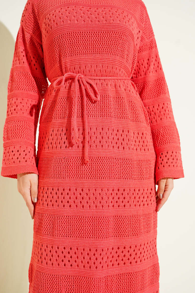 Şerit Ajur Desen Triko Elbise Bordo