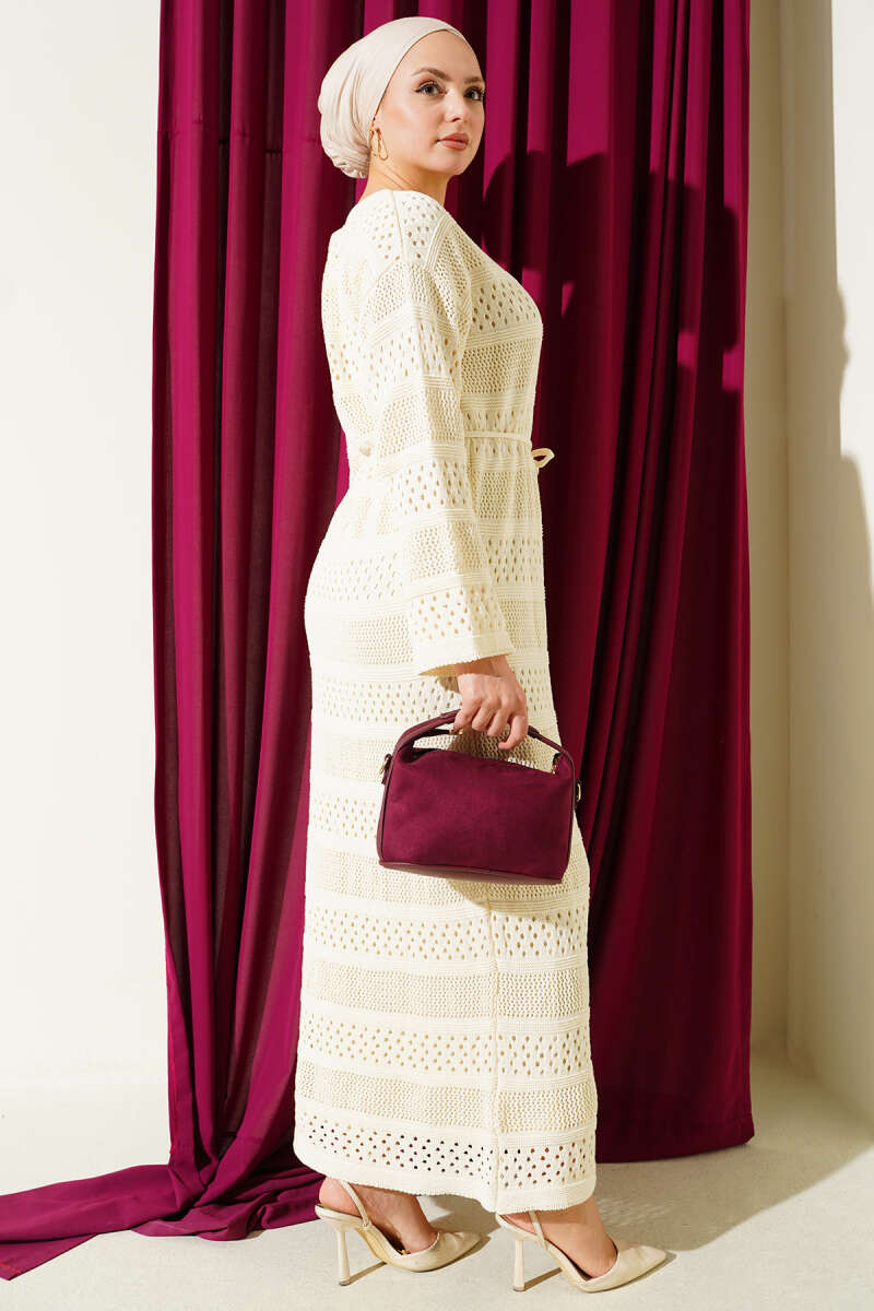 Şerit Ajur Desen Triko Elbise Gül Kurusu