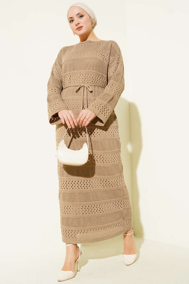 Şerit Ajur Desen Triko Elbise Bej
