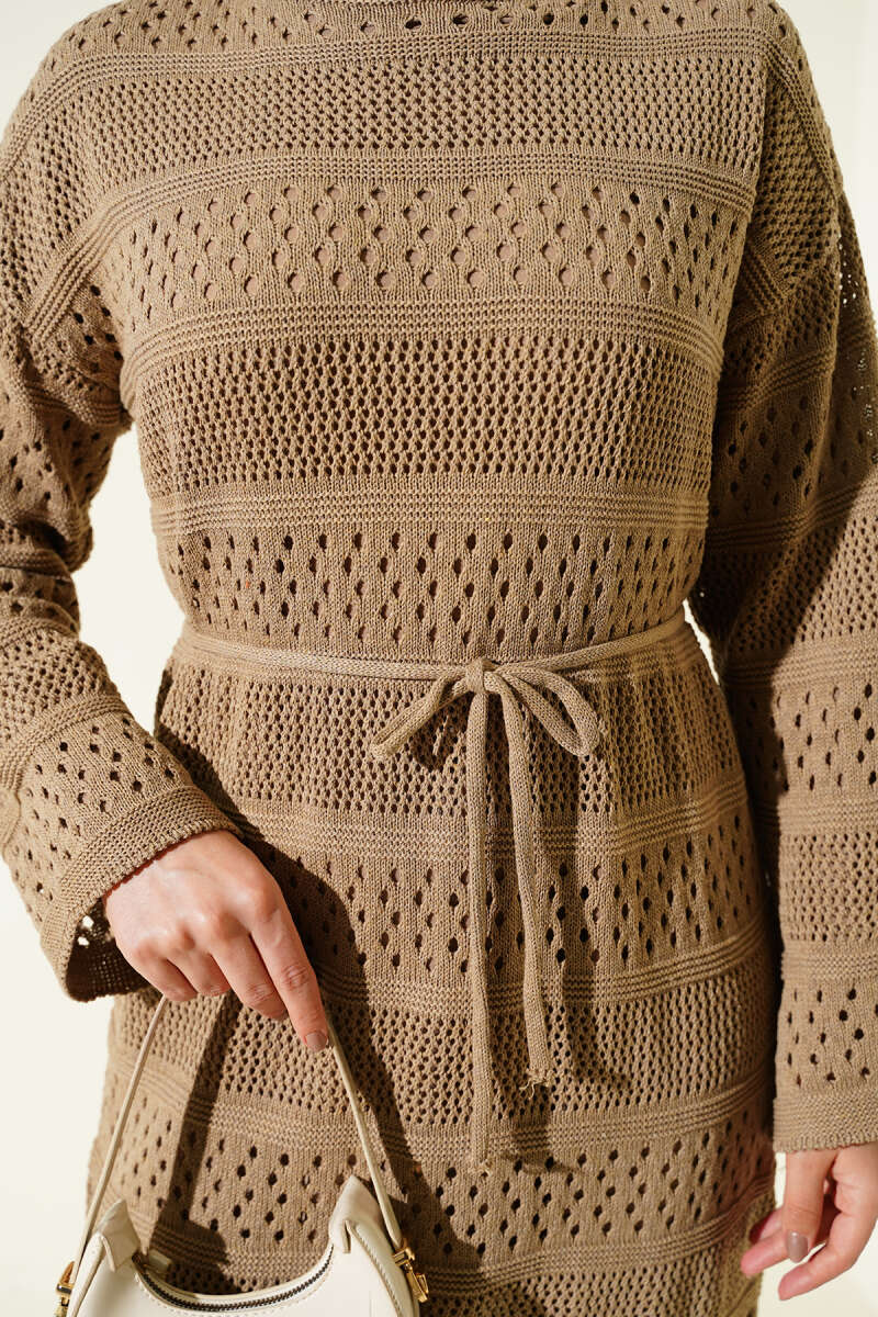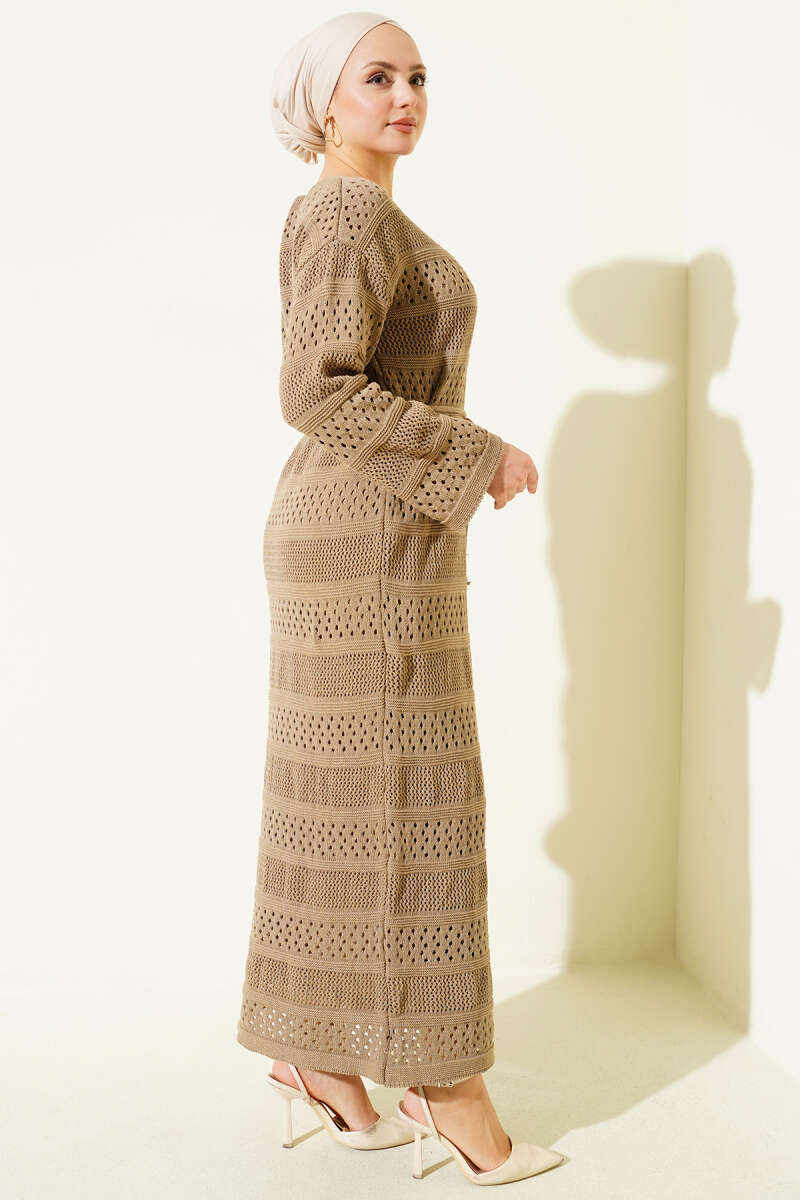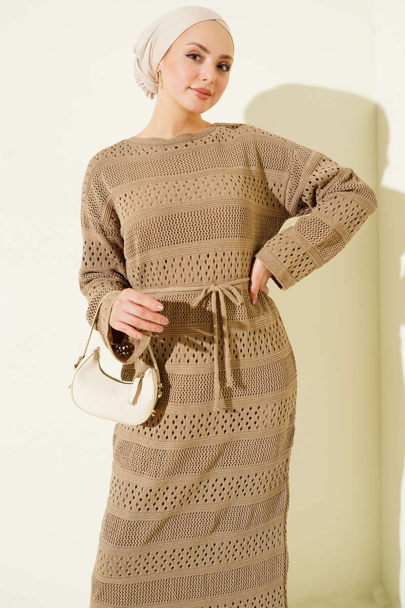 Şerit Ajur Desen Triko Elbise Acı Kahve