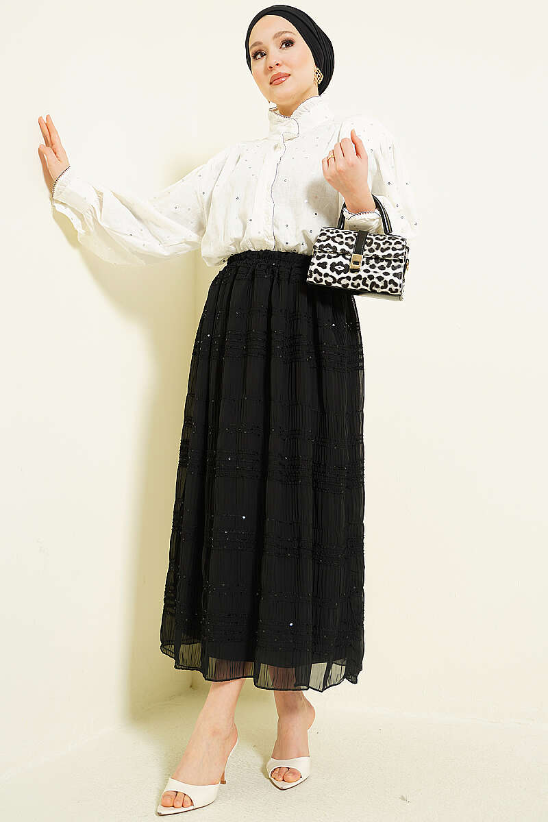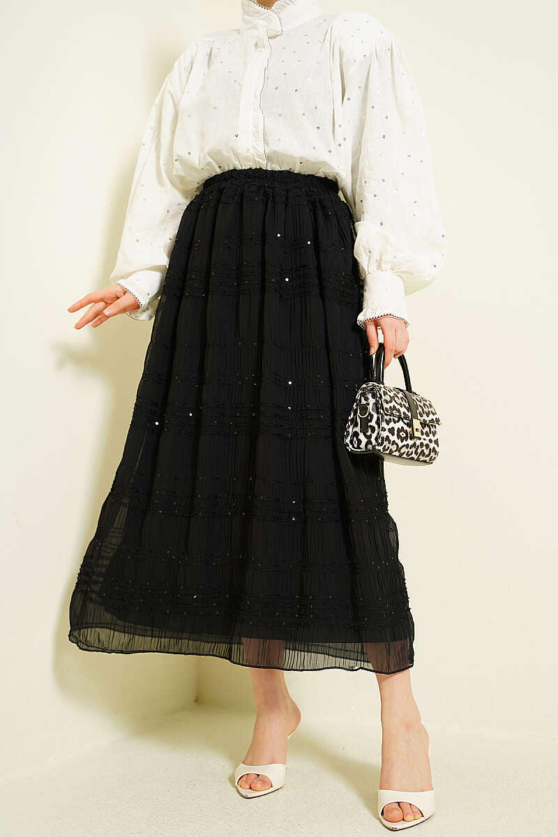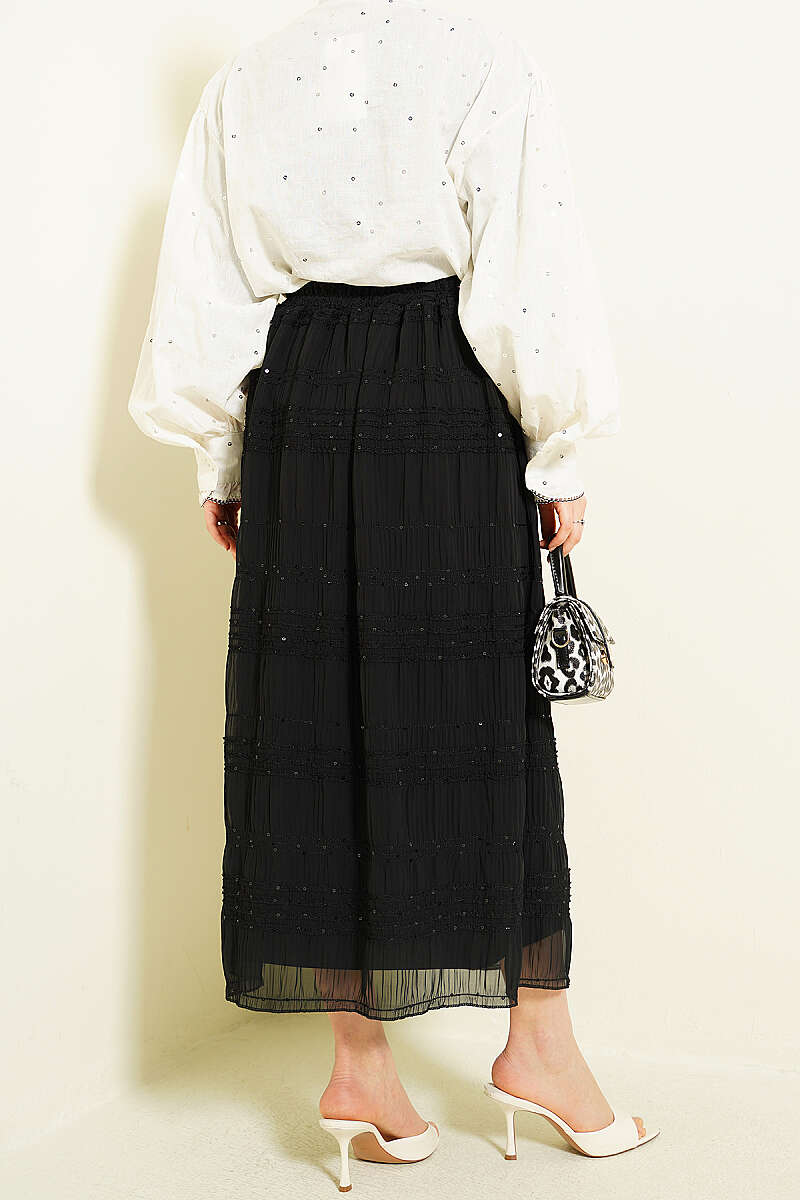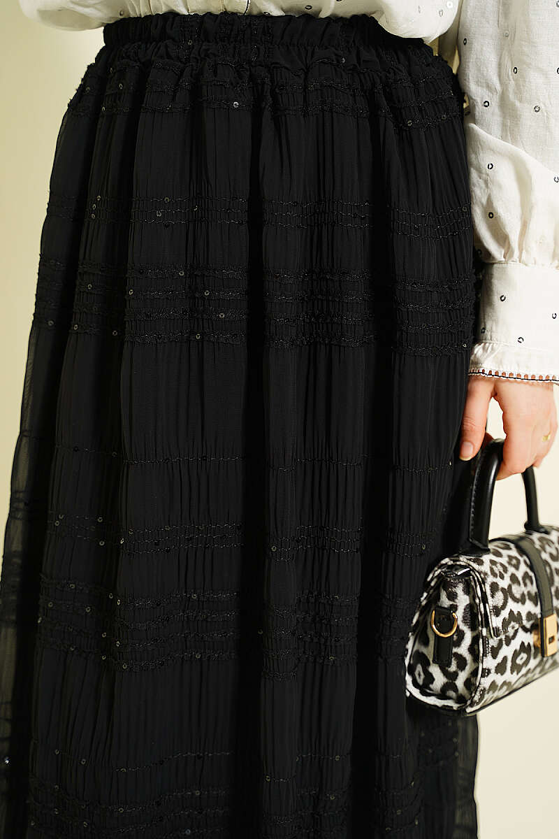 Şerit Büzgülü Pullu Şifon Etek Siyah