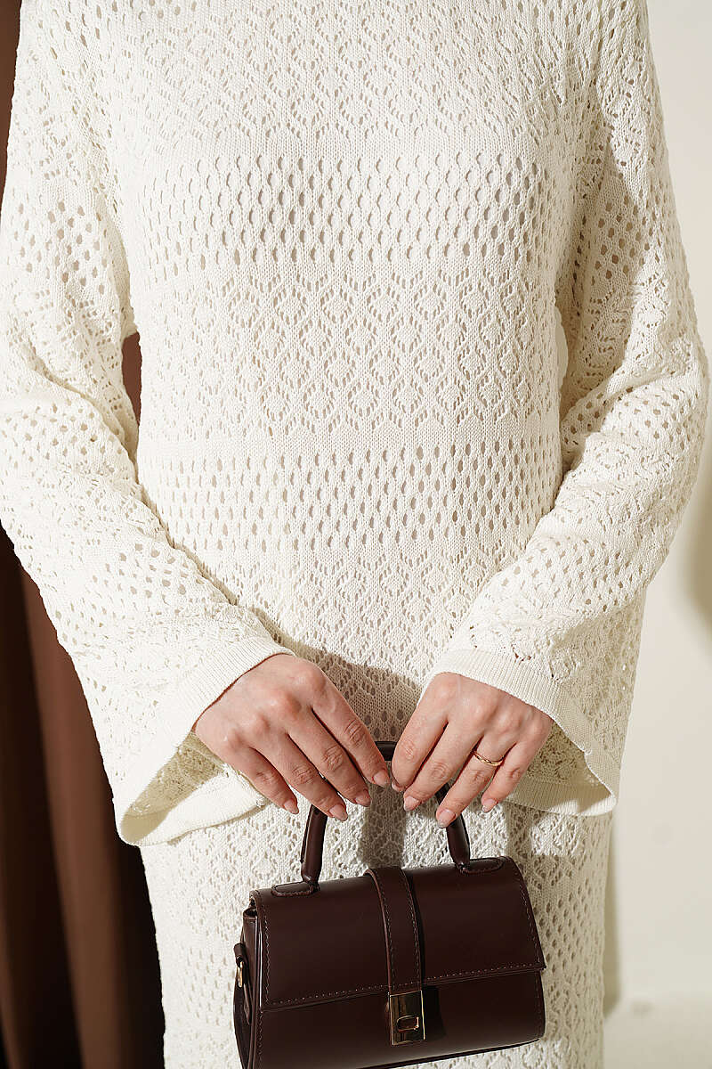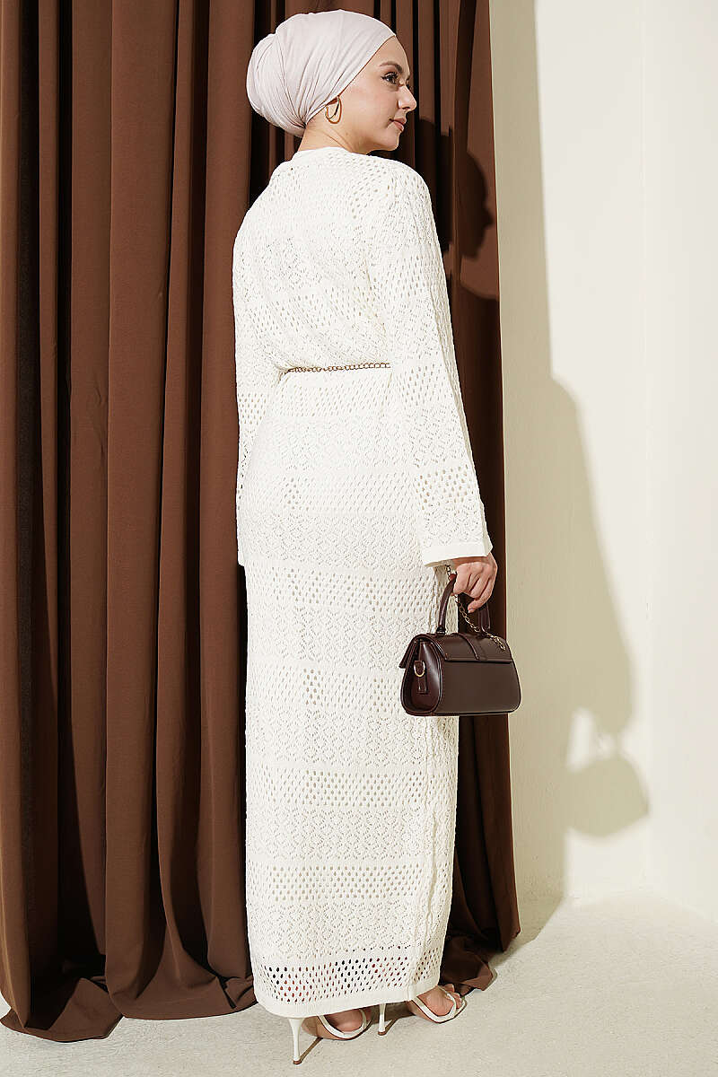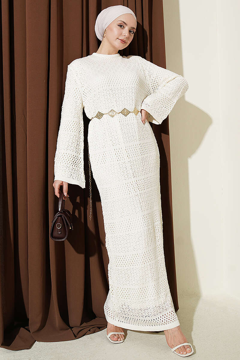 İp Kuşaklı Kare Ajurlu Triko Elbise Pudra