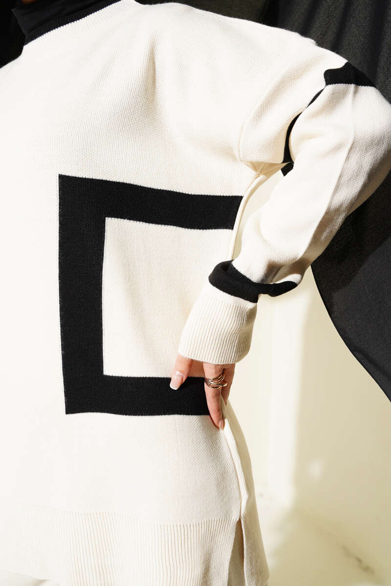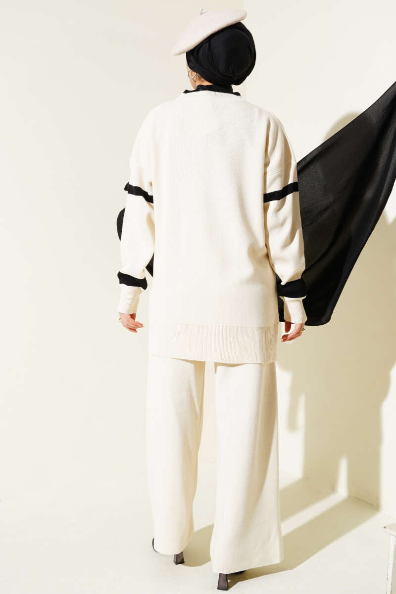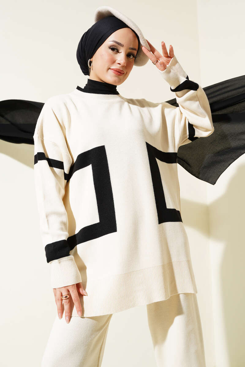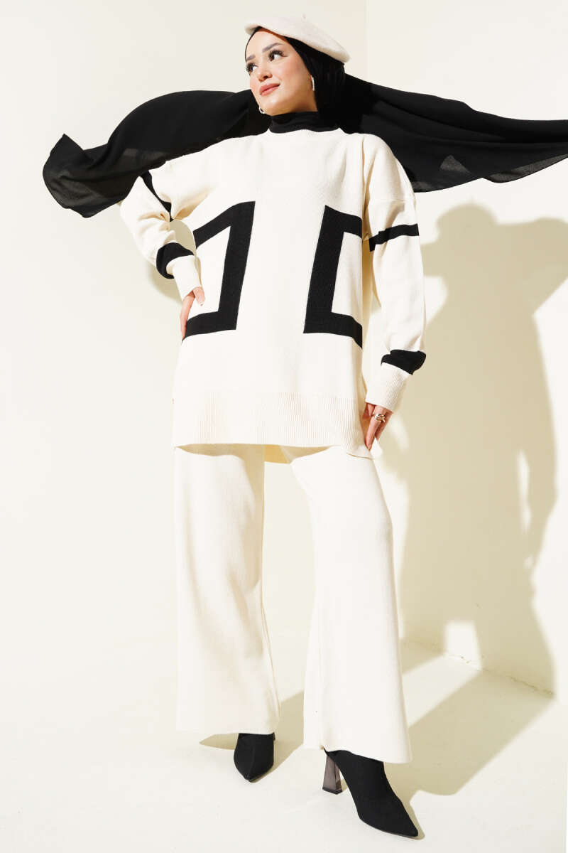 Taşlı Baklava Desen Triko İkili Takım Ekru