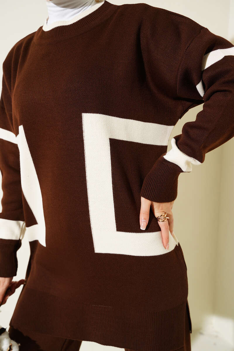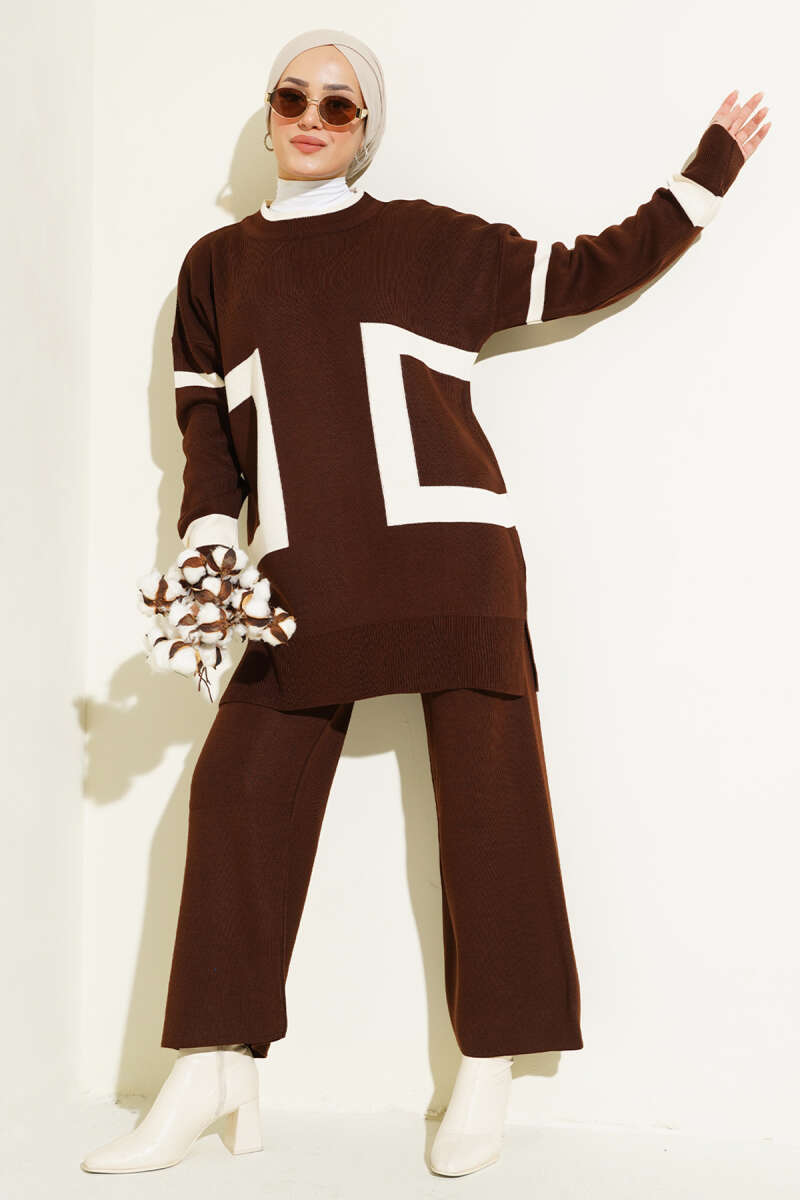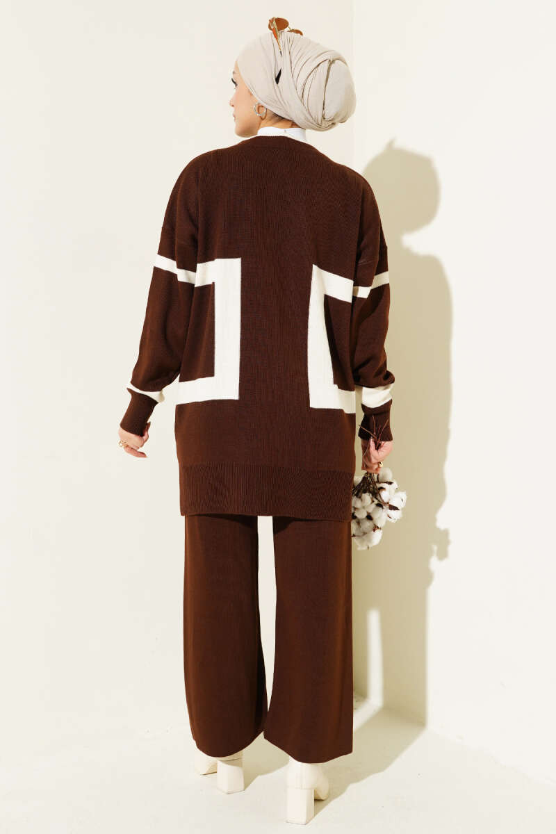 Taşlı Baklava Desen Triko İkili Takım Kahve