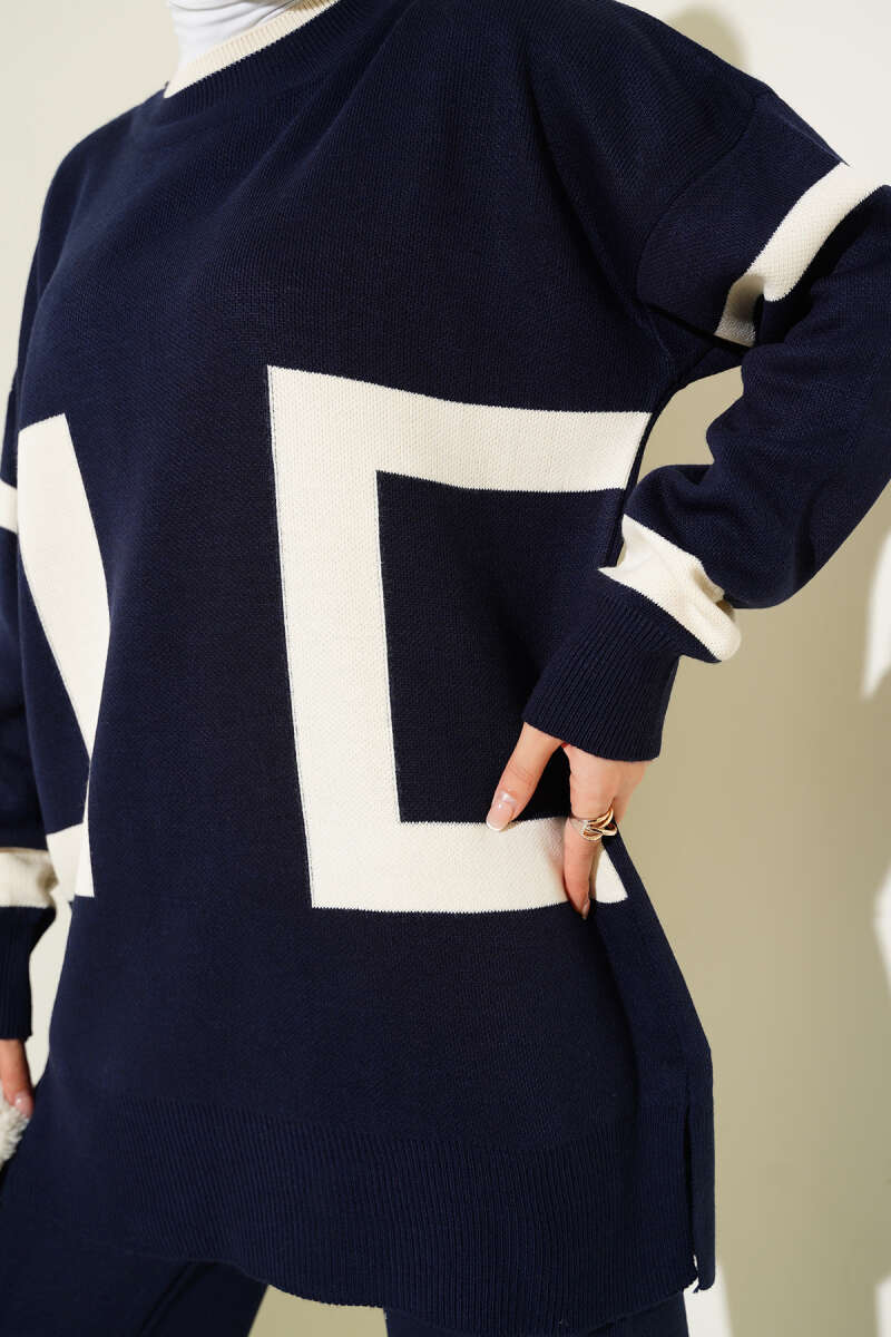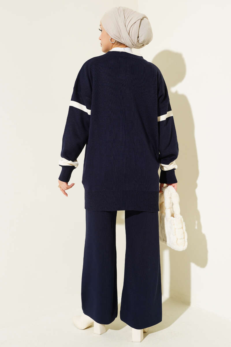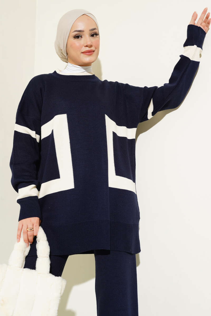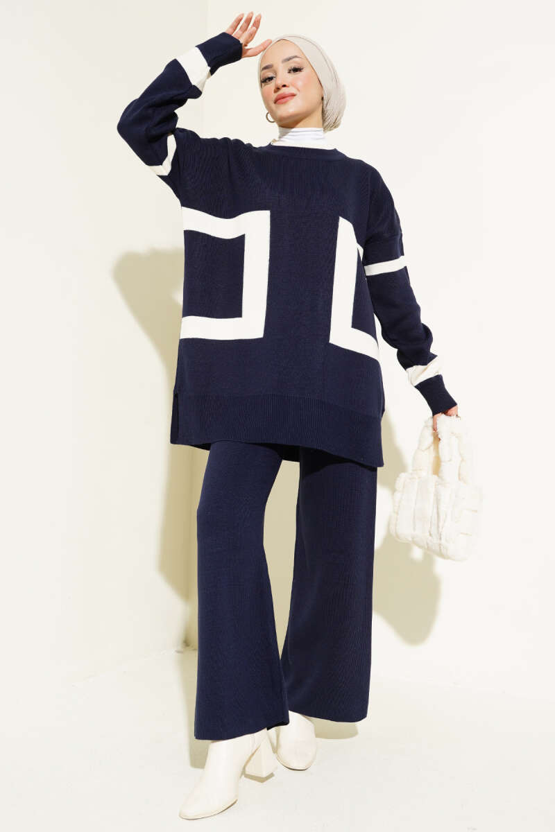 Taşlı Baklava Desen Triko İkili Takım Buz Mavisi