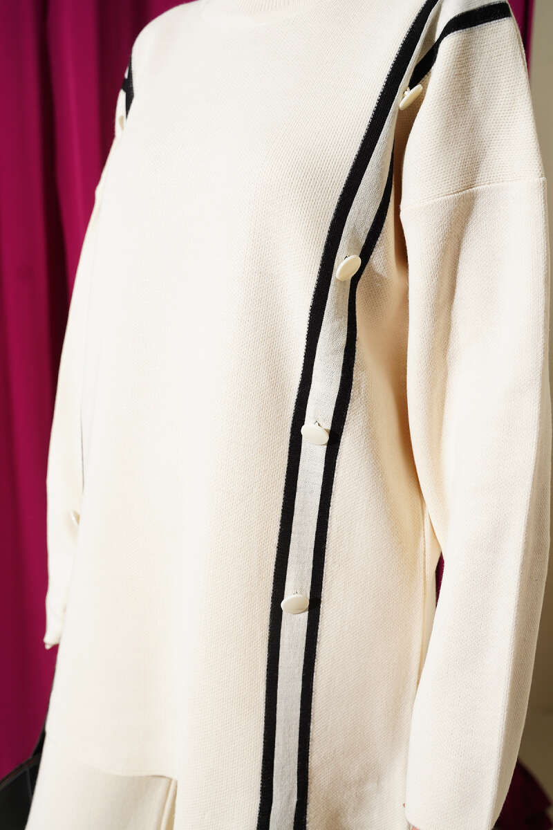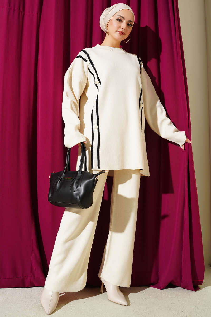 Şerit Detaylı Düğmeli Triko İkili Takım Latte
