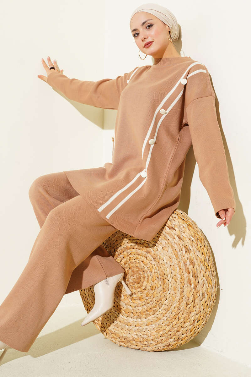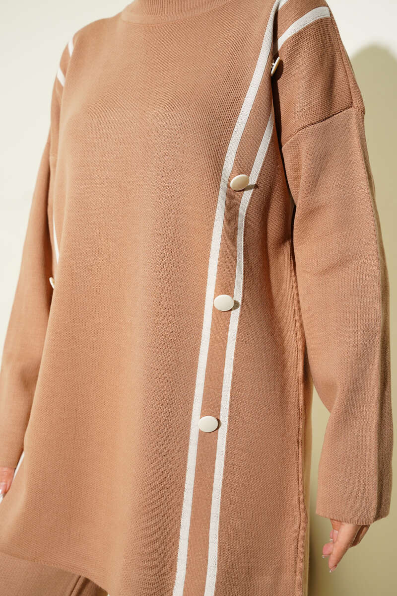 Şerit Detaylı Düğmeli Triko İkili Takım Bej