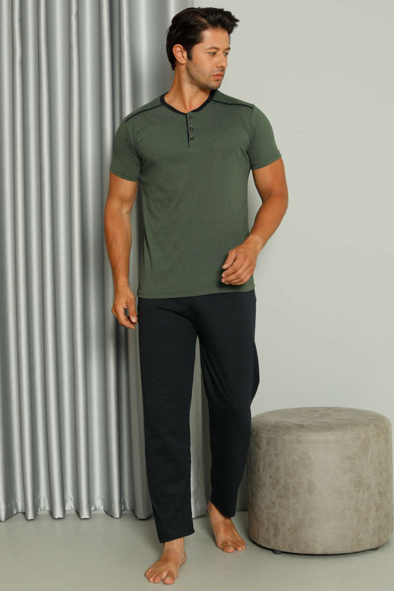 Şerit Detaylı Kısa Kol Erkek Pijama Takımı Haki