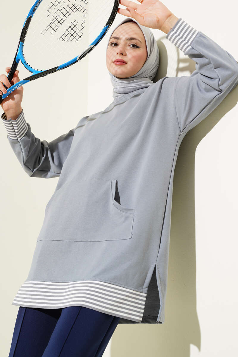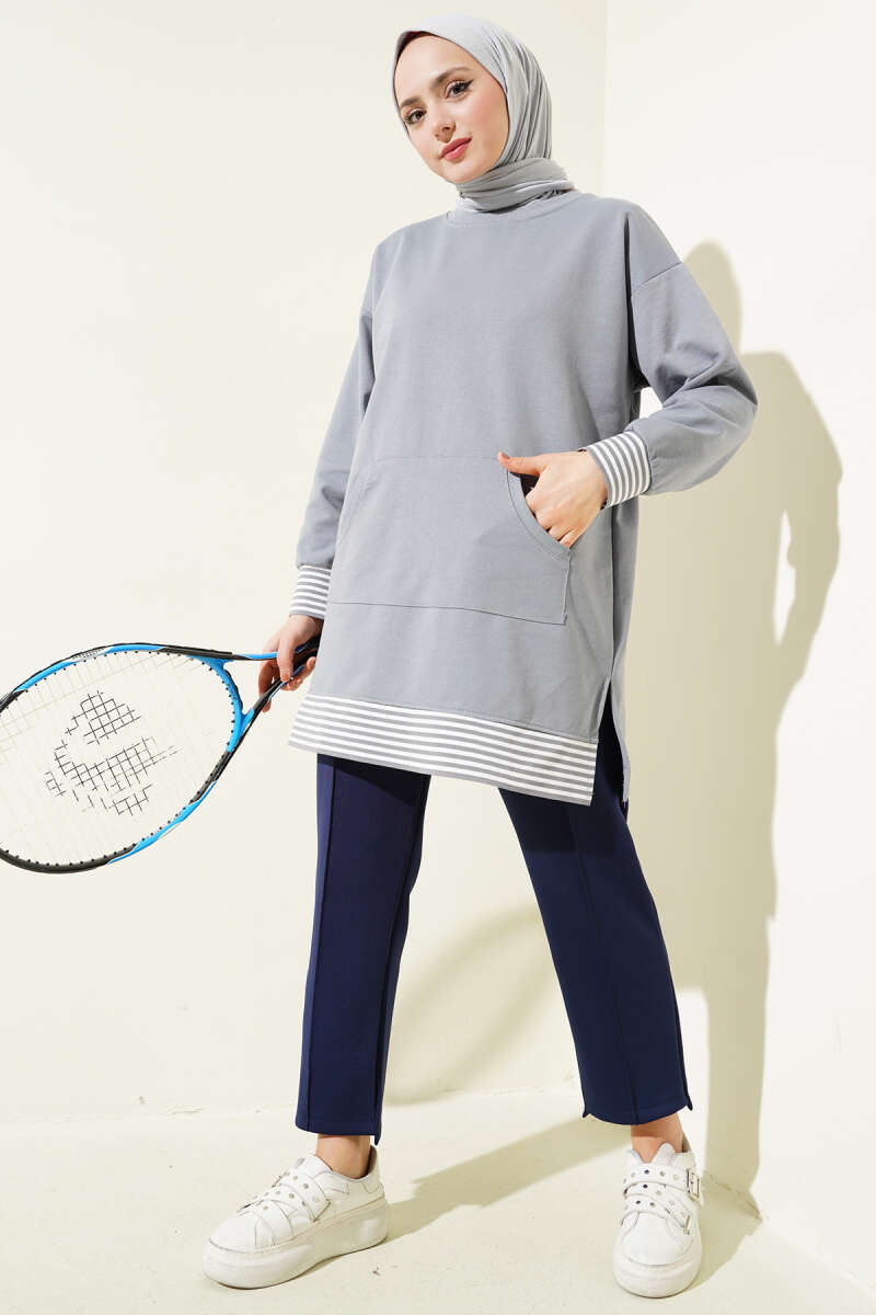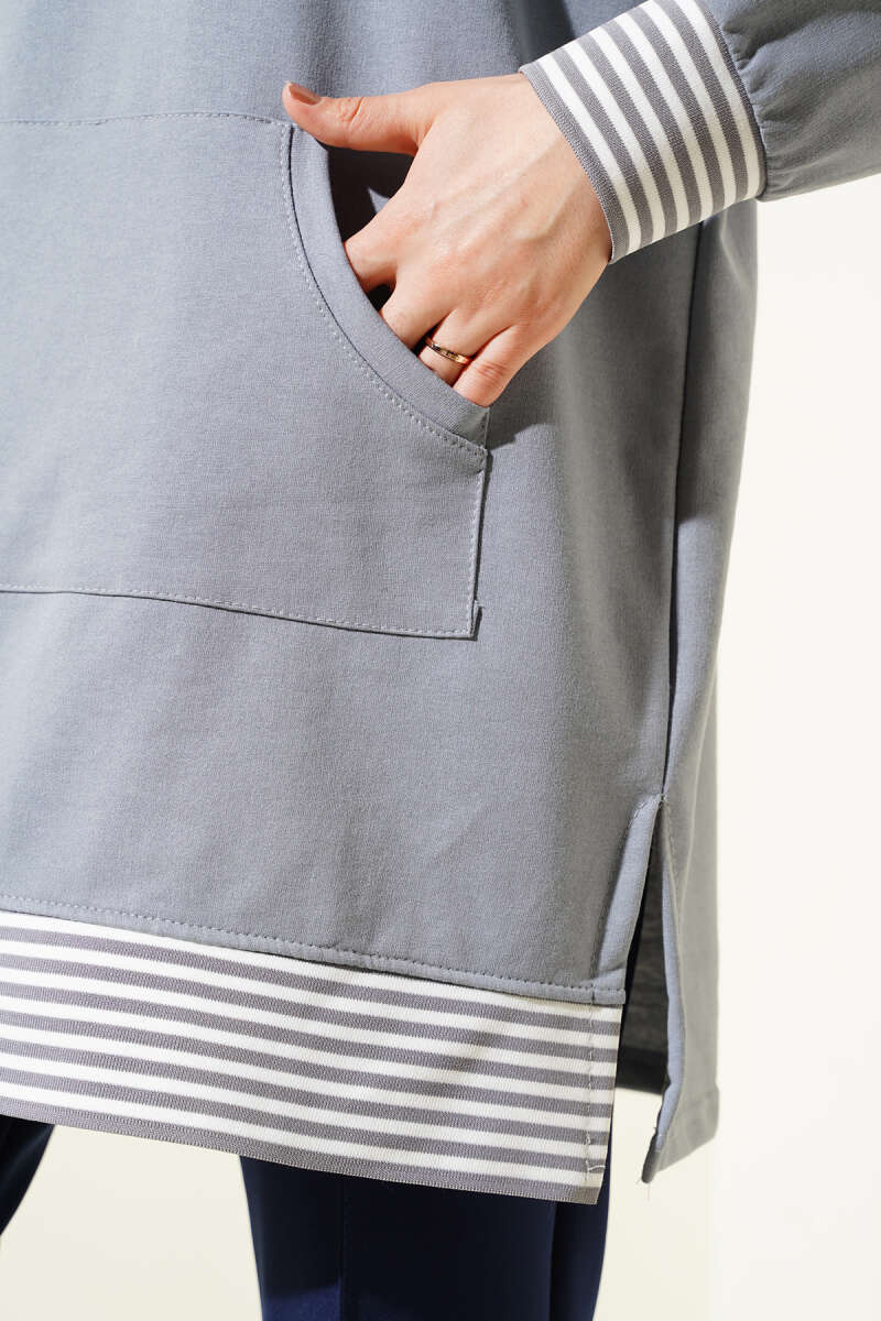 Şerit Ribanalı Kanguru Cepli Tunik Kayrak Grisi