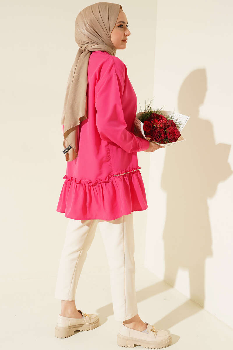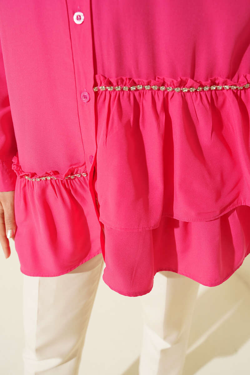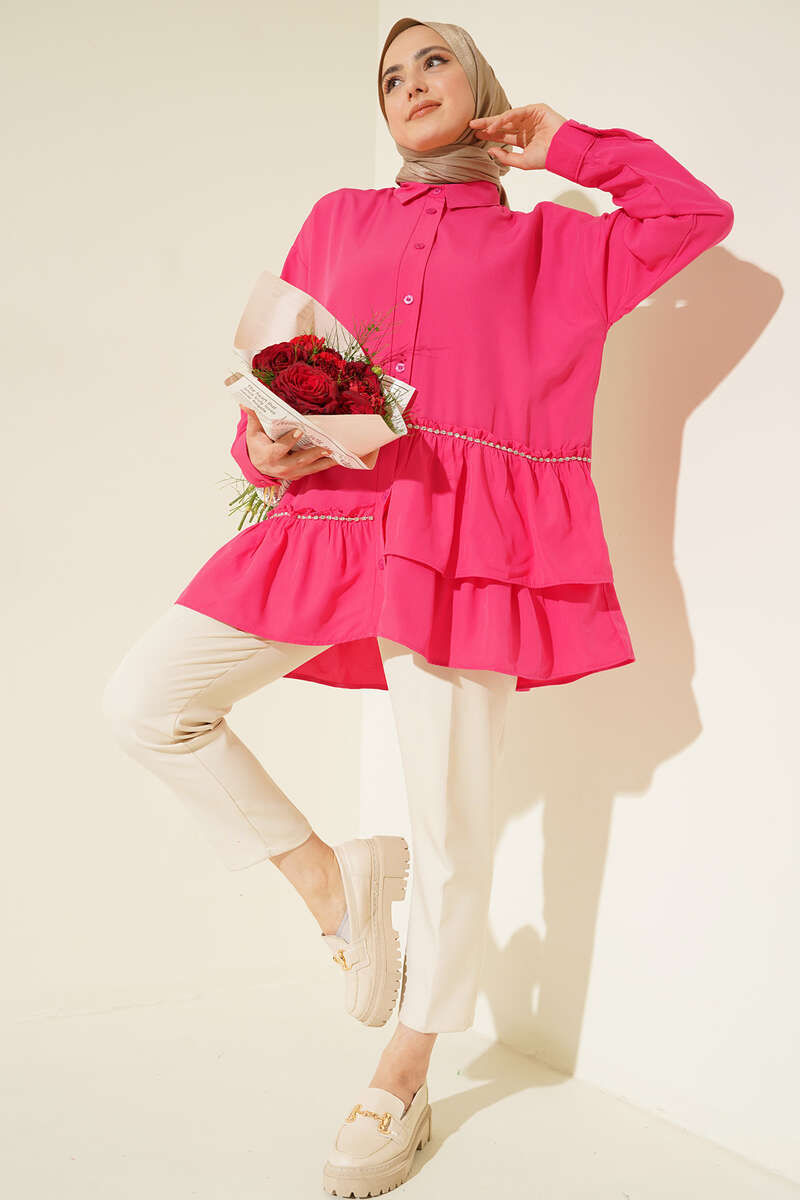 Yeni sezon gömleğimiz önünde bulunan şerit şeklinde parlak taşlarla süslenerek şık bir görünüme kavuşmuştur. Önünde ve bilek kısmında düğmeler bulunan gömleğimiz dikkat çeken bir tasarıma sahiptir.