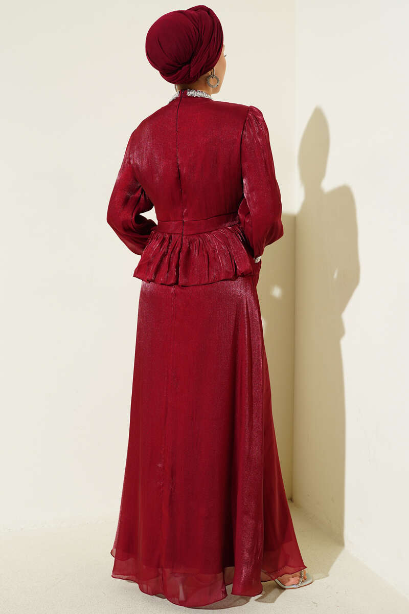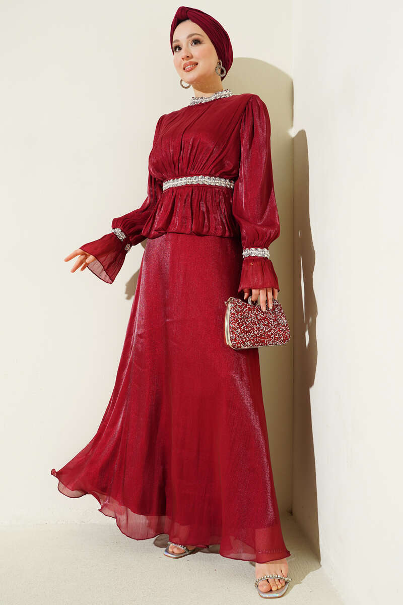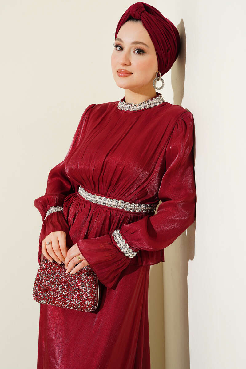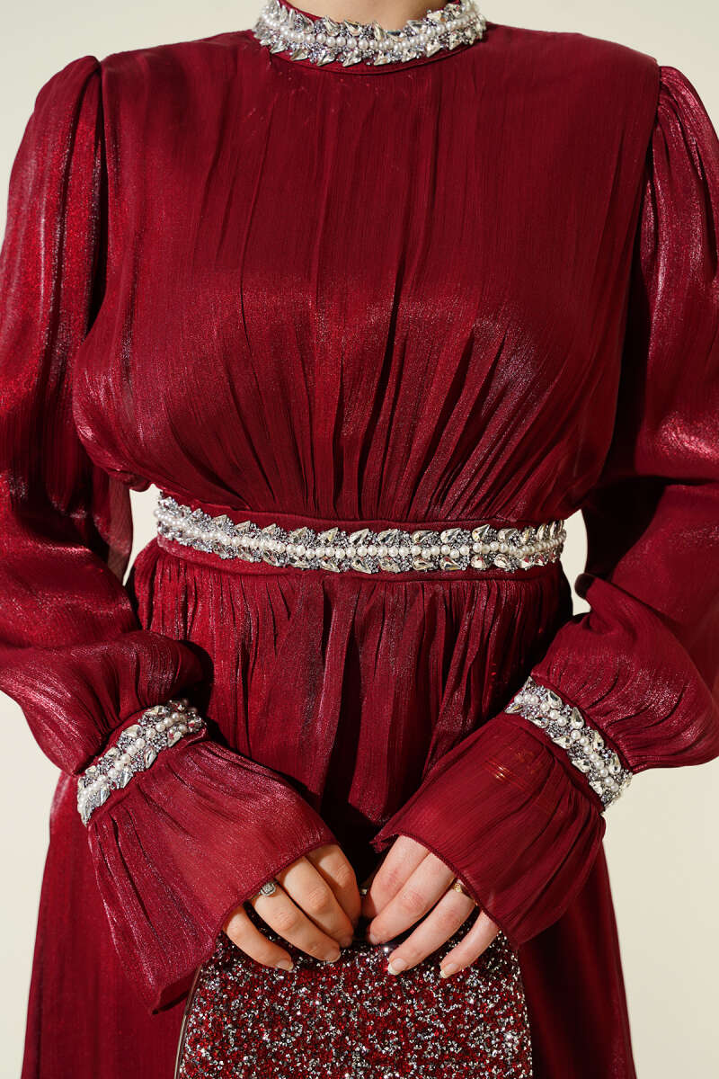 Şerit Taş Süslemeli Abiye Elbise Bordo
