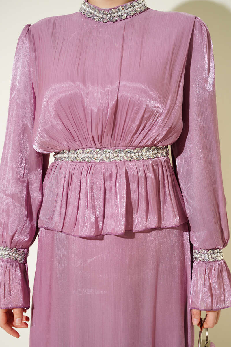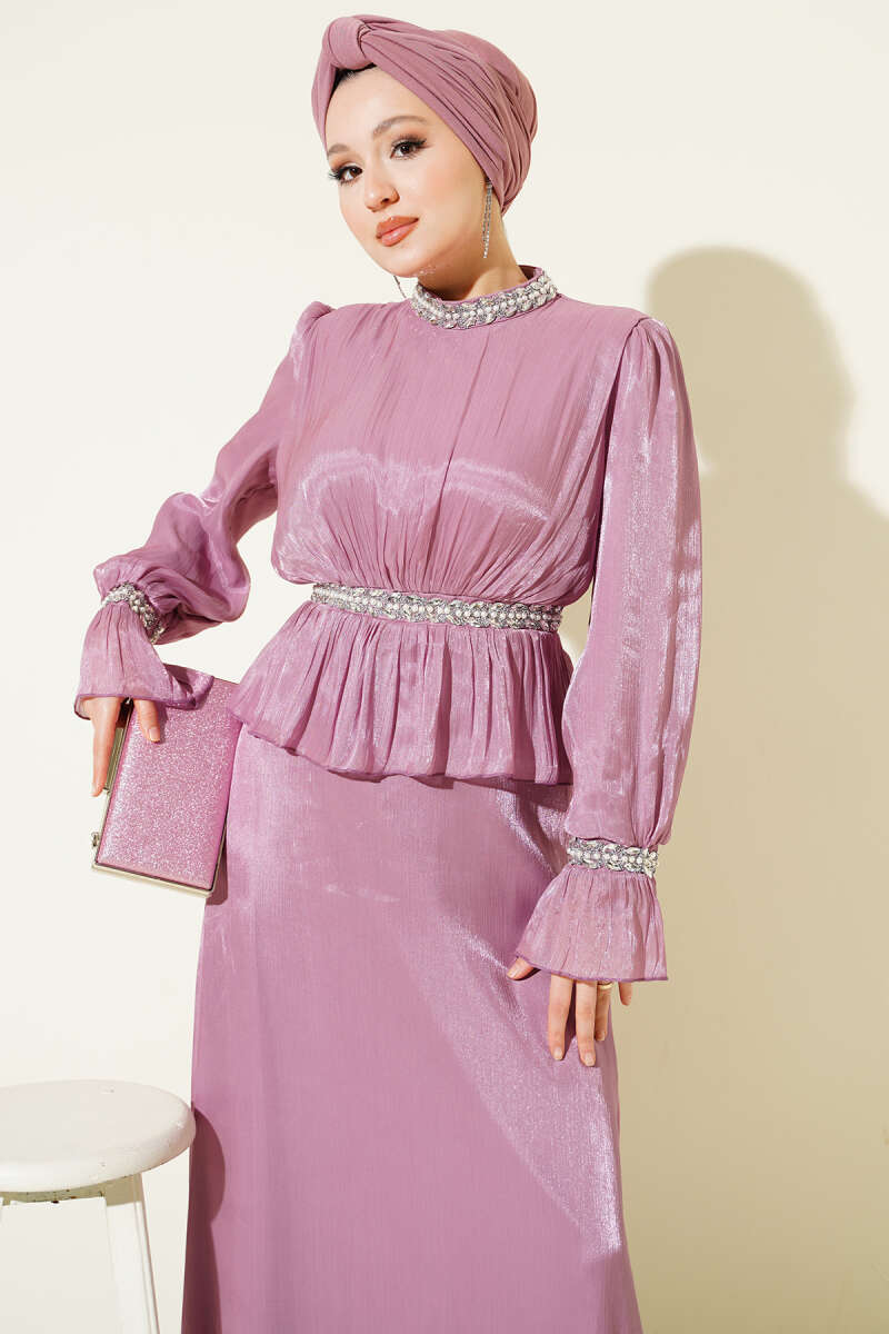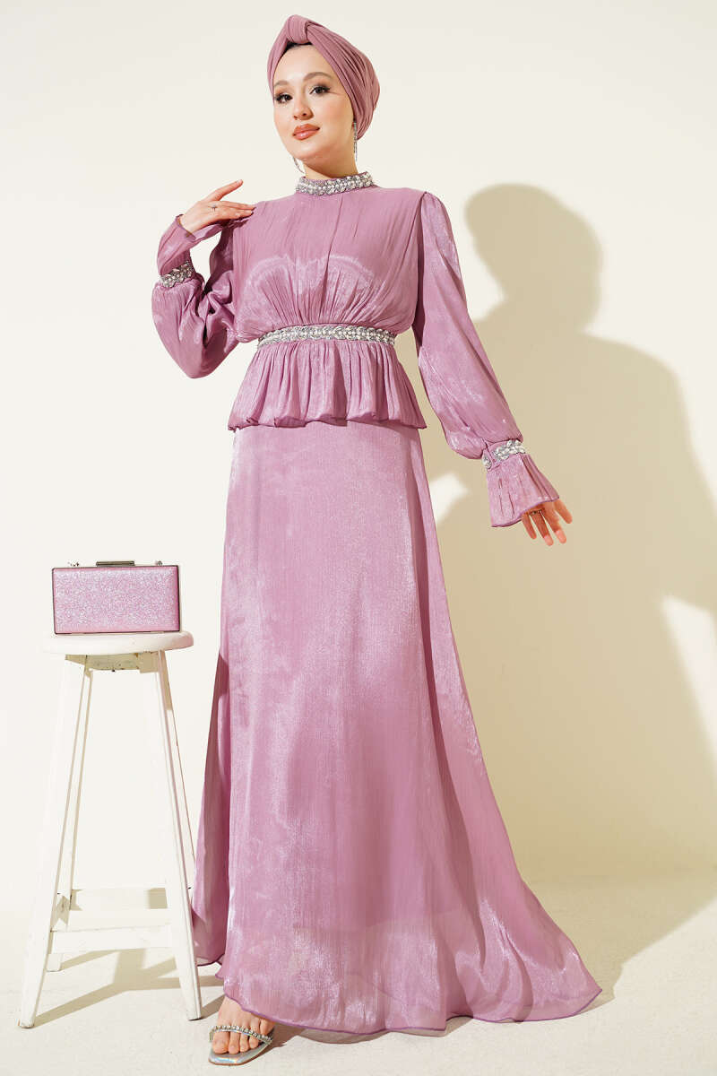 Ayna Kemerli Balon Kol Abiye Elbise Bej