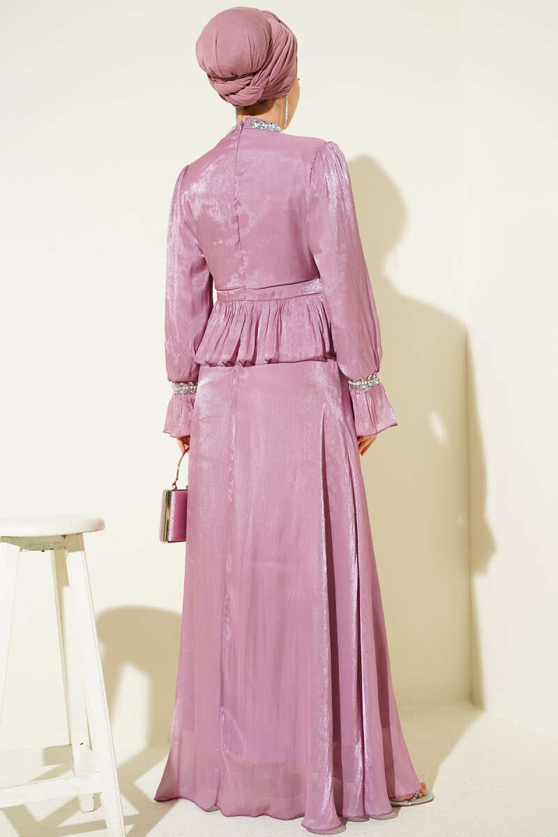 Balon Kol Beli Drapeli Abiye Elbise Kahve