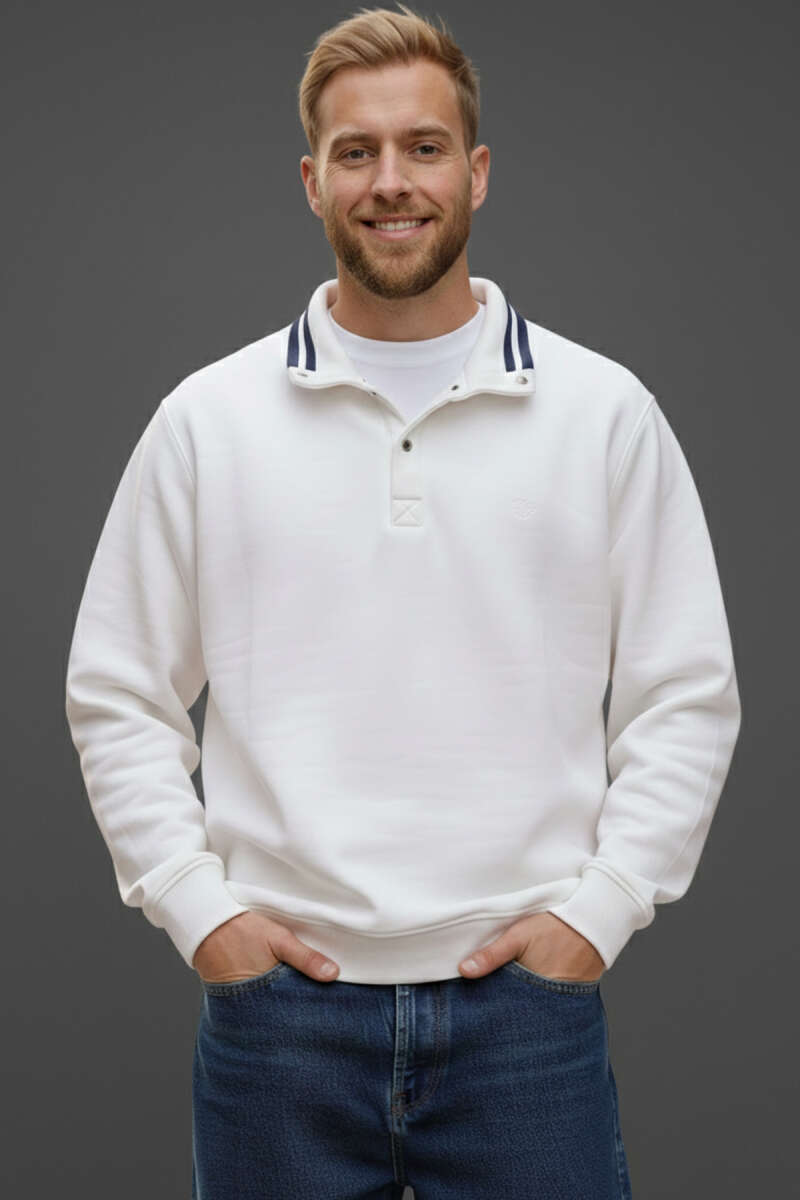 Polo Yaka Fermuarlı Jakarlı Erkek Sweatshirt Beyaz