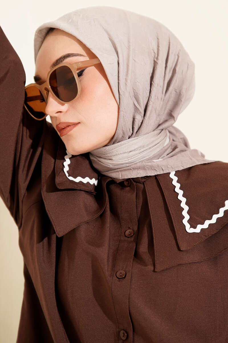 Gömlek Yaka Düğmeli Çizgili Triko Kazak Latte