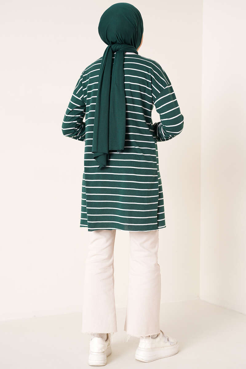 Yeni sezon model tunik yatay şeritleriyle sportif kombinlerinizin tamamlayıcı parçası olacaktır. Bisiklet yaka olan tuniğimiz düşük omuz modeldir. Yanlarında yırtmaçları bulunan tuniğimiz çeşitli renkleriyle kombinlerinize renk katacaktır.