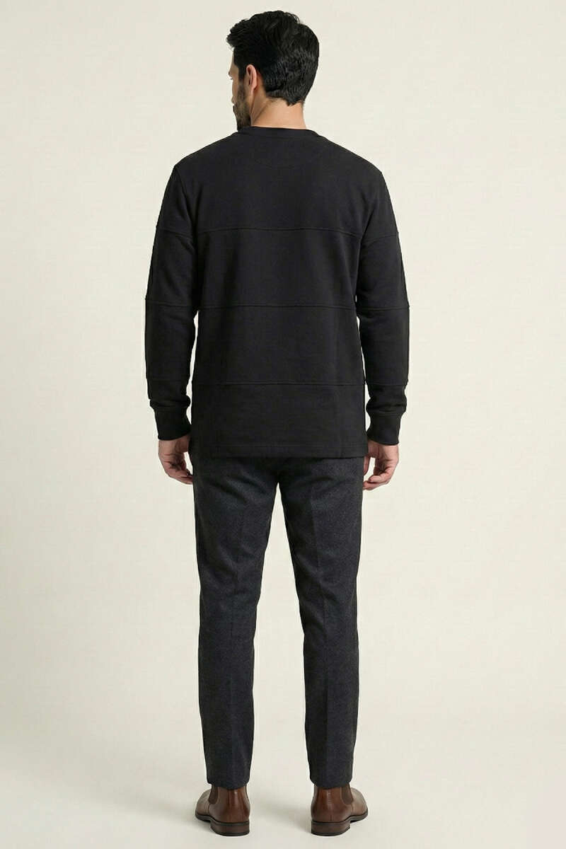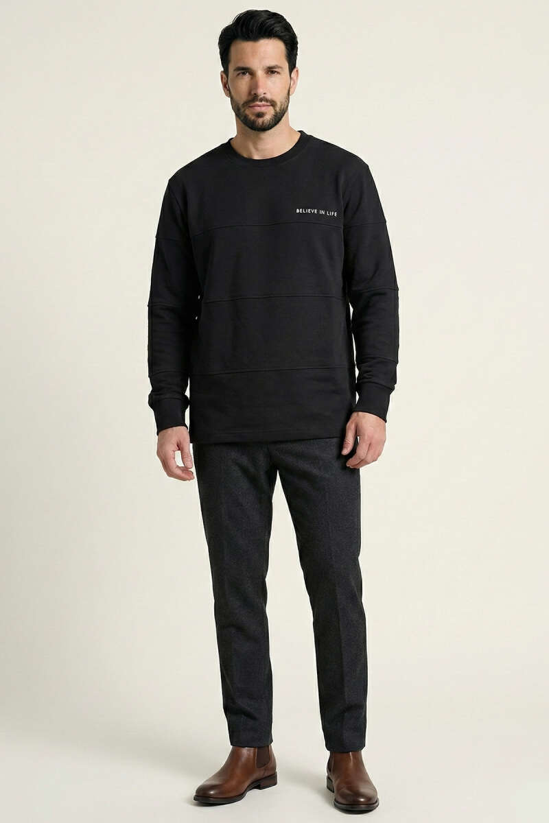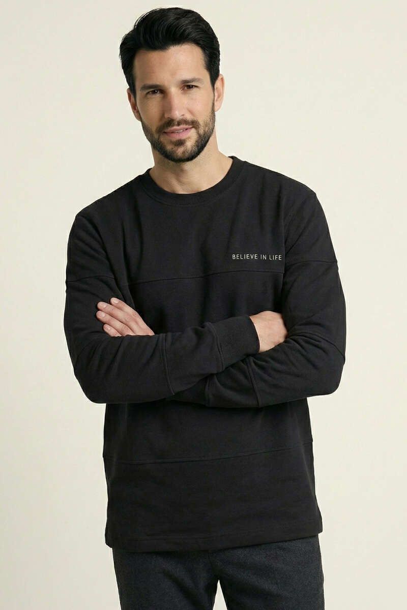 Şeritli Yaka Yazılı Erkek Sweatshirt Siyah