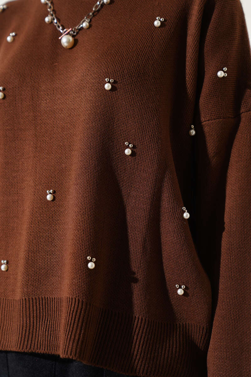 Kayık Yaka Yumoş Triko Kazak Kahve