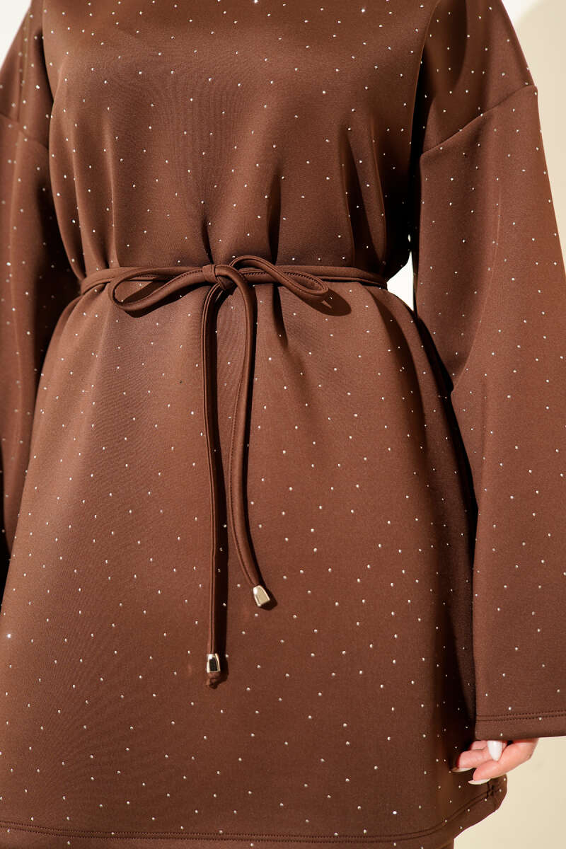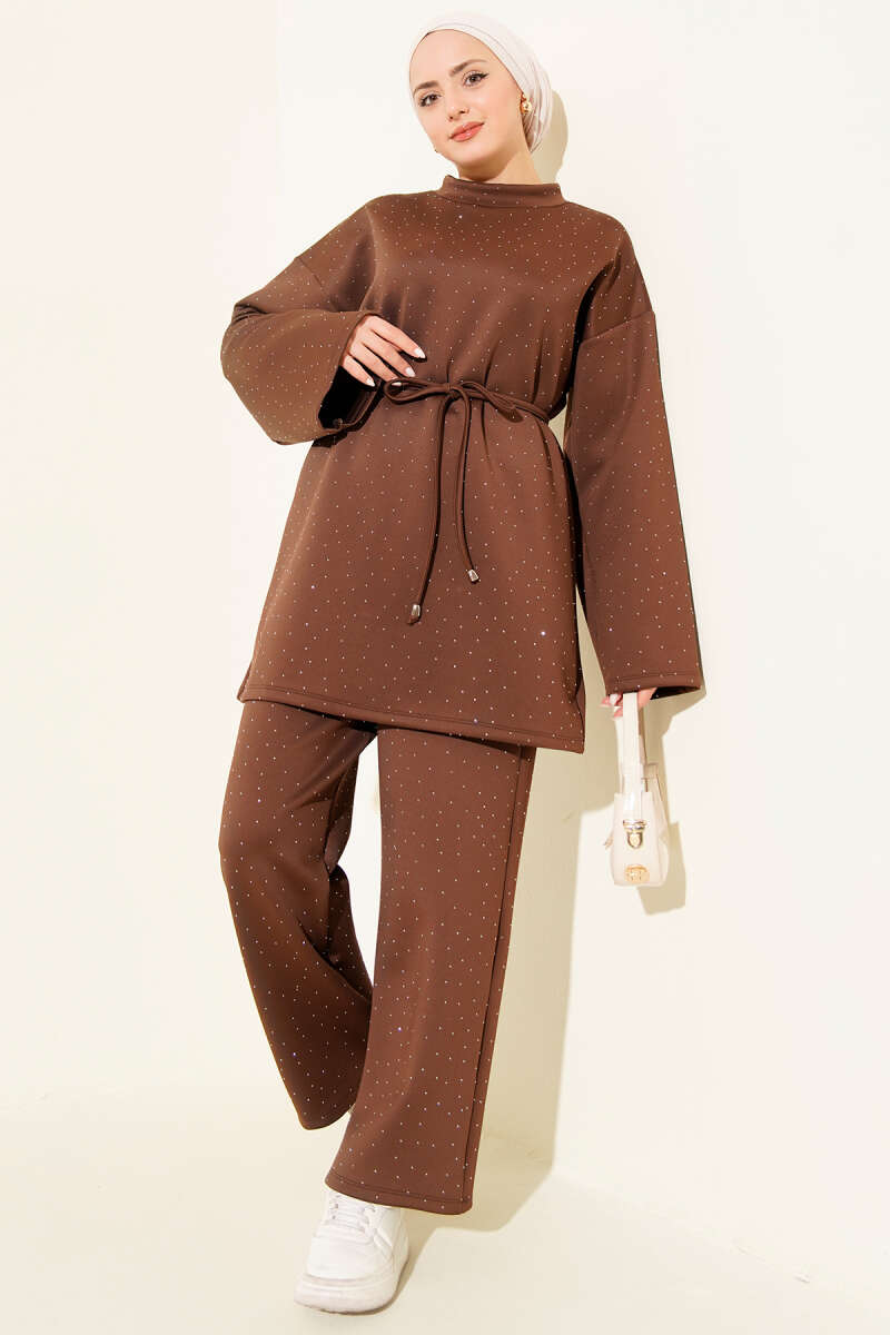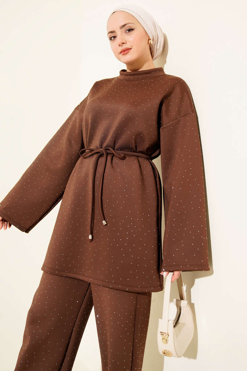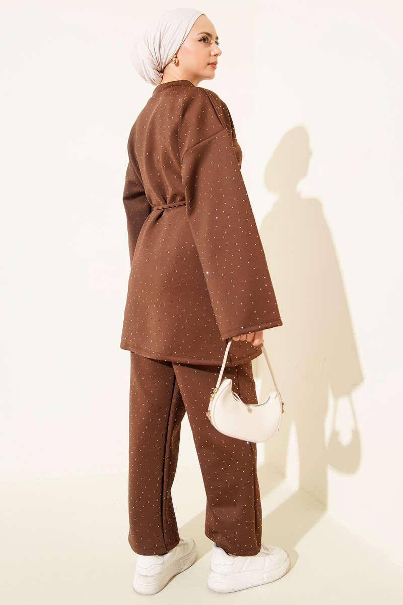 Metal Düğmeli Kuşaklı İkili Takım Kahve