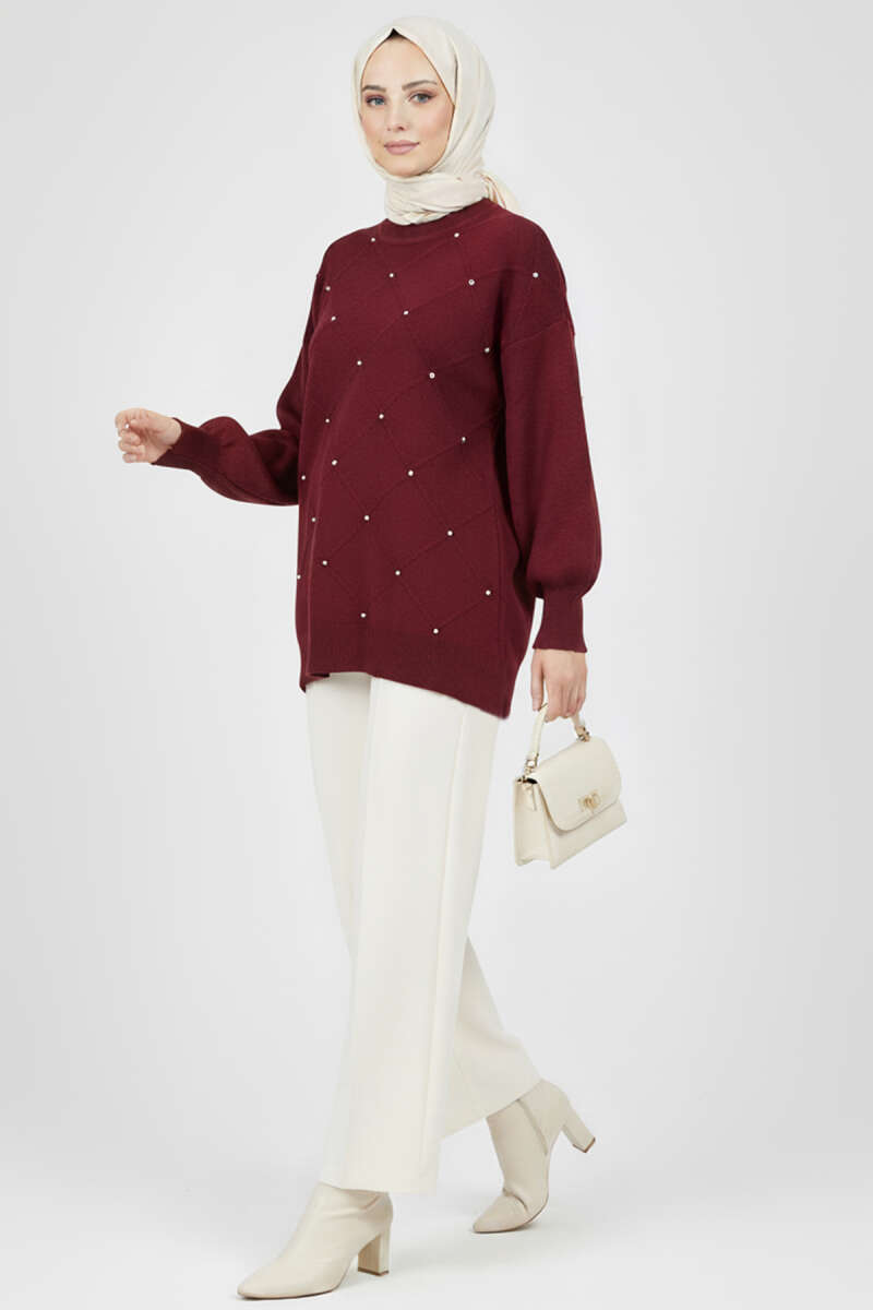 Atkılı Şerit Detaylı Triko İkili Takım Bordo