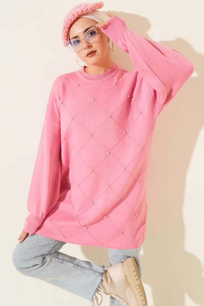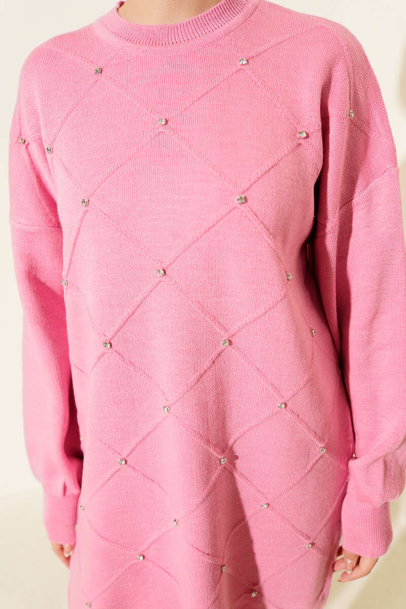 Serpme Taşlı Triko Tunik Yağ Yeşili