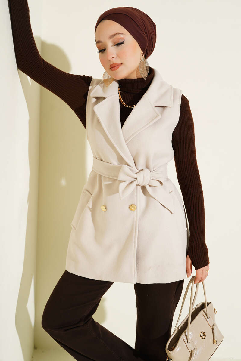 Sıfır Kol Kuşaklı Kaşe Yelek Saks